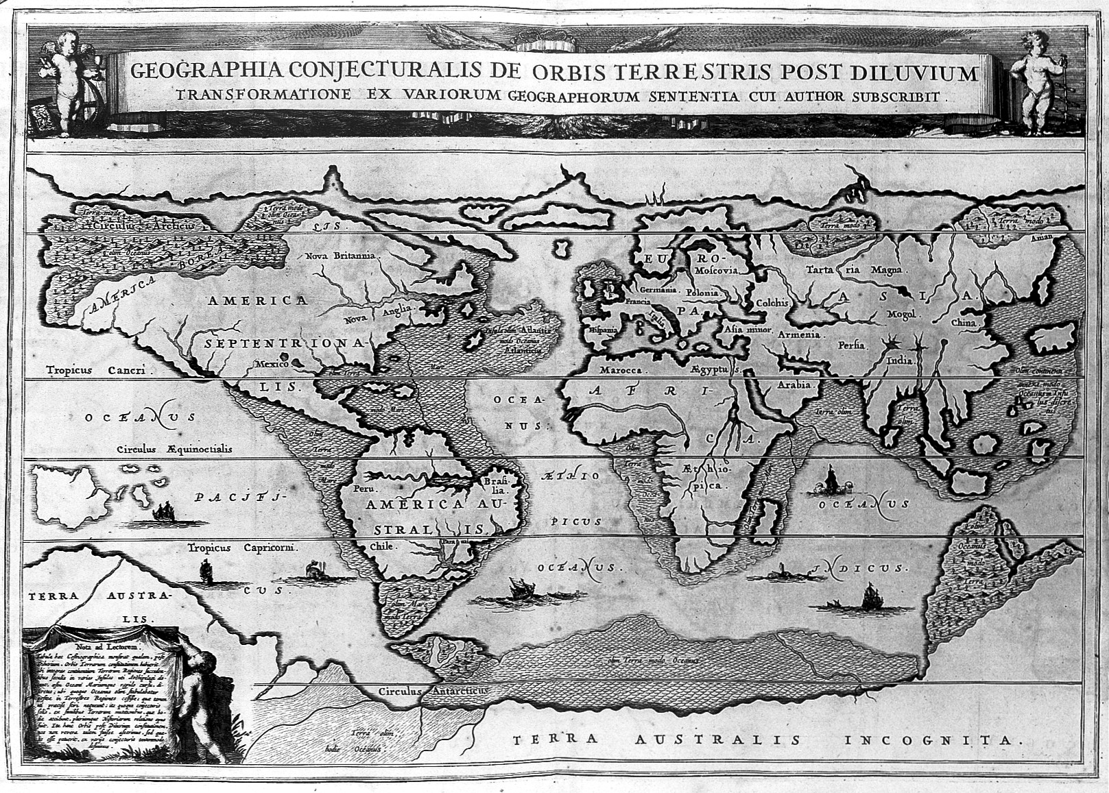 Также ему принадлежат некоторые весьма интересные карты. И одна из них датируется 1675 годом и имеет весьма интересное название «Географическая карта мира после потопа», которая была создана на основе старых — допотопных источников из библиотеки Ватикана и с учетом изменения береговой линии континентов уже после глобального потопа, уничтожившего единую ведическую цивилизацию «золотого века». То есть по результатам «эпохи географических открытий», которая на самом деле была эпохой послепотопного восстановления мореходства и разведки изменившейся береговой линии континентов.