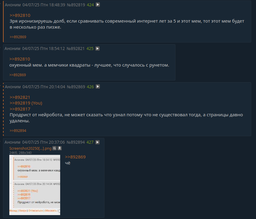 С учётом материалов из предыдущих тредов, не знаю актуально ли слово "теория" в оглавлении треда, боты есть и дохуя, они выдают себя за людей и генерируют контент. Вначале это перекрывали тем, что ботов нету, нам всё кажется и мы все шизы, потом что боты есть, но их легко сдетектить, теперь перекрывают тем, что боты всегда были и в этом нет ничего такого. Не ведитесь на уловки ботов. Следующие треды предлагаю сделать номерными, но кто помнит нумерацию тредов? На моей памяти это либо 3, либо 4 тематический тред. В треде обсуждаем кто и зачем заполняет интернет ботами, где остались (и остались ли) места без ботов, как отличать ботов от реальных пользователей и прочее по теме.