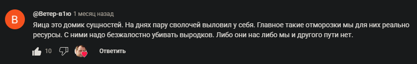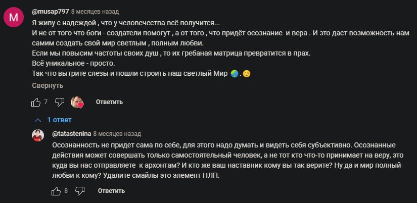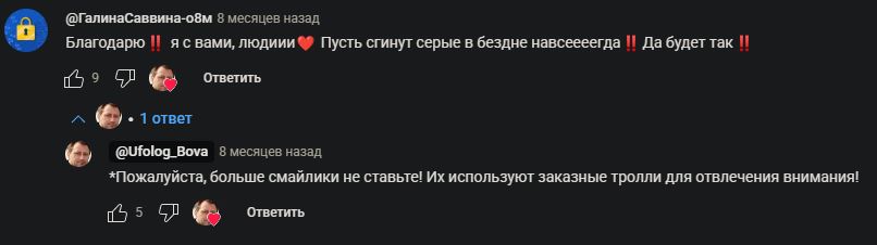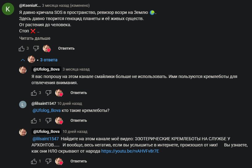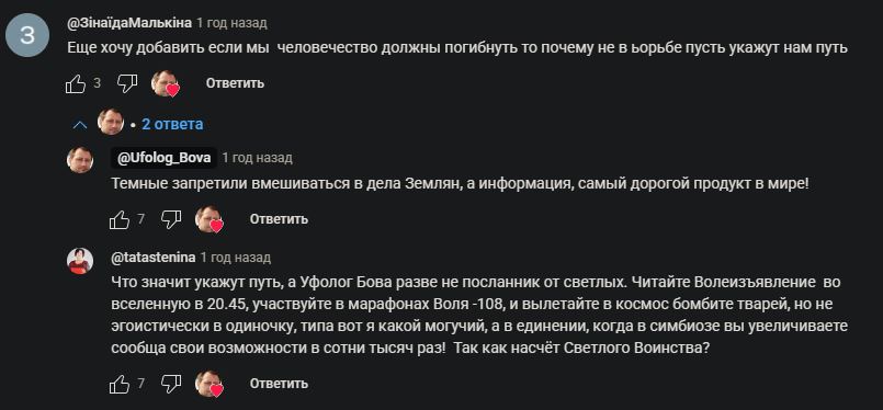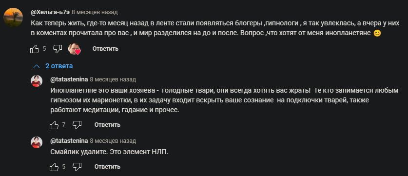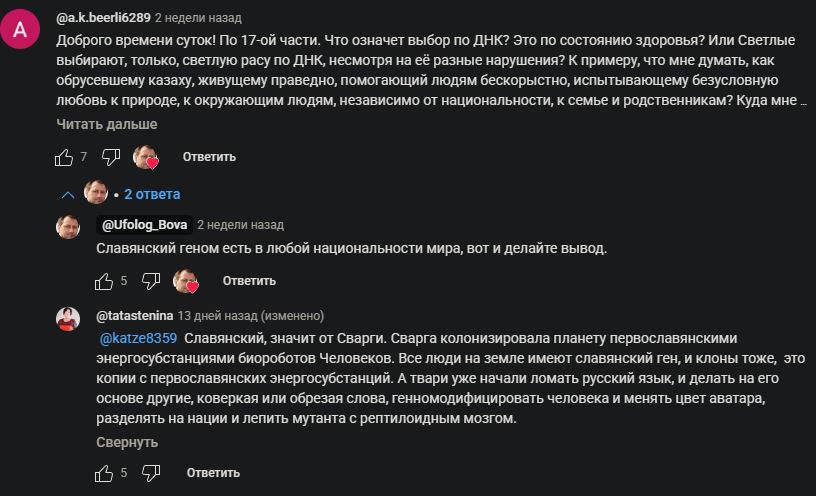 Обращаюсь к людям, которые не знакомы с этим каналом, если вы хоть немножечко, хоть чуточку, остаётесь адекватным человеком, то подумайте хорошенько, нужно ли вам связаться с этими "откровениями". Прикладываю немного скринов только из под одного видоса.