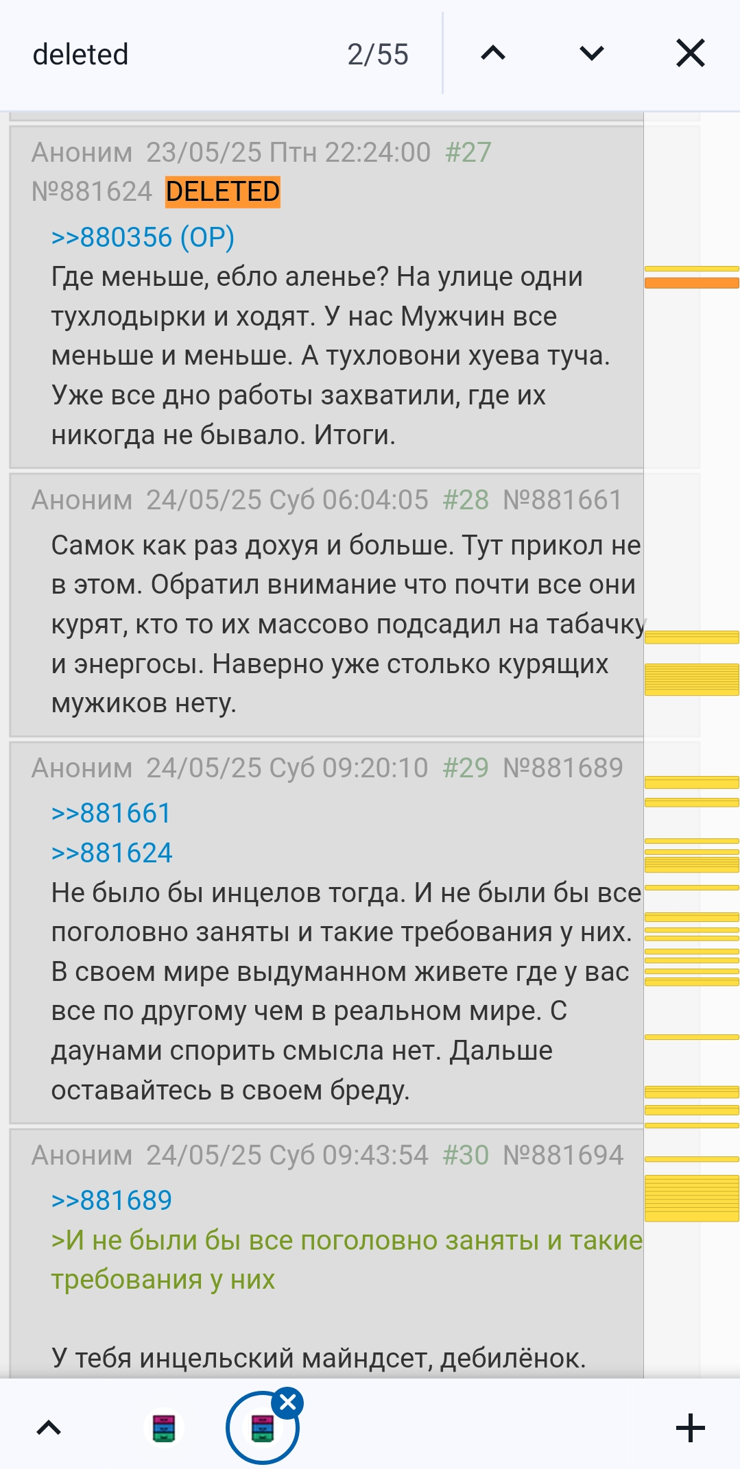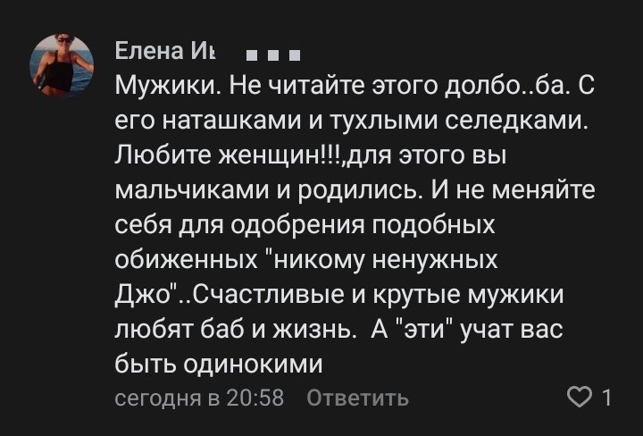 >>907084 >А что если весь хейт мужчин к женщинам исключительно потому что положение женщин в обществе объективно лучше по всем параметрам. Ну да, у меня еще и гендерная дисфория (причем не удивлюсь, что последний гвоздь туда забили всякие инцел - треды с сосаки и МДшники), конечно мне завидно женщинам. Хотя это только половина от причин хейта, селедки воспитывают хуемразей «настоящими мужиками», а всех кто не хочет быть тупым рабом пизды в делириуме «мужыковости» клеймят педиком или еще что похуже.