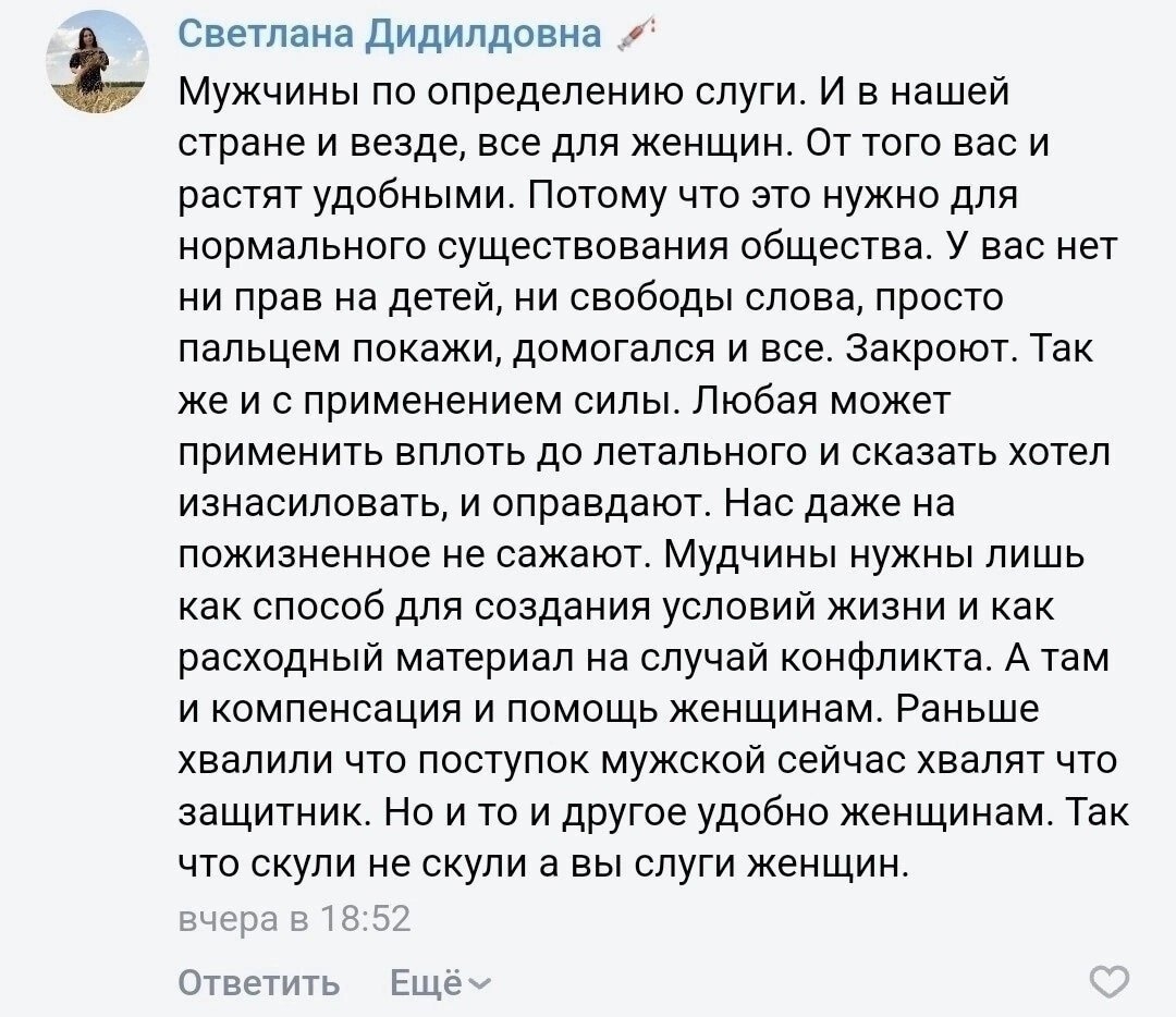 Суть в том, что холопы могут сколько угодно коупить. Но это не меняет того, что у женщин сейчас есть возможность жить без черных полос хоть 100 лет - как на курорте или в сказке, и нихуя не делать ради этого. Пока холопов учат терпеть, подавлять эмоции, выходить из зоны комфорта, рвать перделы и ишачить на износ. Ах да, они ещё при этом обязаны в окопы пиздовать, и в случае военного положения им закрывают краницы. А женщина свободно может кататься куда угодно, как в мирное время.