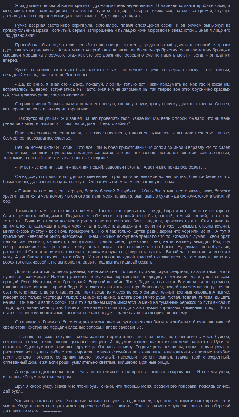 Долго я скитался по лесам разным, а все житья нет. То тишь, пустыня, скука смертная, то жуть такая, что и лучше не вспоминать! Наконец решился: в мужичка перекинулся, в бродягу с котомкой, да и ушел совсем: прощай, Русь! Ну а там, мне братец мой. Водяной пособил. Тоже, бедняга, спасался. Все дивился он: времена, говорит, какие настали - просто беда. И то сказать: он хоть и встарь баловался, людей там заманивал, да зато как лелеял, как ласкал их у себя на золотом дне, какими песнями чаровал! А нынче, говорит, все только мертвецы плывут, видимо-невидимо, а влага речная что руда, густая, теплая, липкая; дышать нечем... Он меня и взял с собой. Сам-то в дальнем море мыкается, а меня на туманный бережок по пути высадил - иди, брат, найди себе кустик. Ничего я не нашел и попал сюда в этот чужой, страшный, каменный город... Вот и стал я человеком, воротнички, сапожки, все как следует - даже научился говорить по-ихнему...