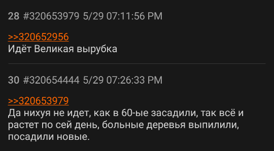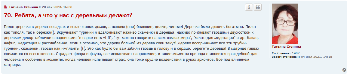 В первом треде около двухсот анонов поделились наблюдением, что в их городах систематически уничтожают деревья. Это какое-то новое веяние, которое мы пытаемся наблюдать и анализировать. Оно существует и на частном, молекулярном (это когда спиливают у себя двчники), и на общем, молярном уровне. Туда же можно отнести предумышленную или бездумную порчу среды: уборку листьев, круглосуточный покос травы, наставление заборов. Это ухудшает качество жизни во всех сферах, способствует уродованию улиц, шумовому загрязнению, нарушению приватности и психическому давлению, кроме того есть опосредованные последствия в виде смерти насекомых, белок и птиц.