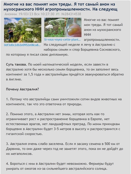 >>885088 1. Чувак в отместку за уничтожение зверья в Австралии решил посеять там борщевик Сосновского. 2. Население севера Евразии тоже истребило множество видов зверья. Вопрос: КТО рассеял борщевик Сосновского в северной Евразии?