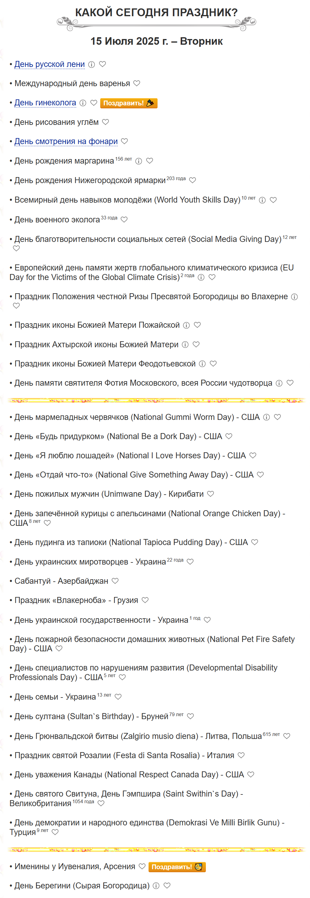 если вбить "какой сегодня праздник ?", то вывалится по 5 праздников ежедневно, несколько сотен праздников в год день пизды, день очка, день сморчка