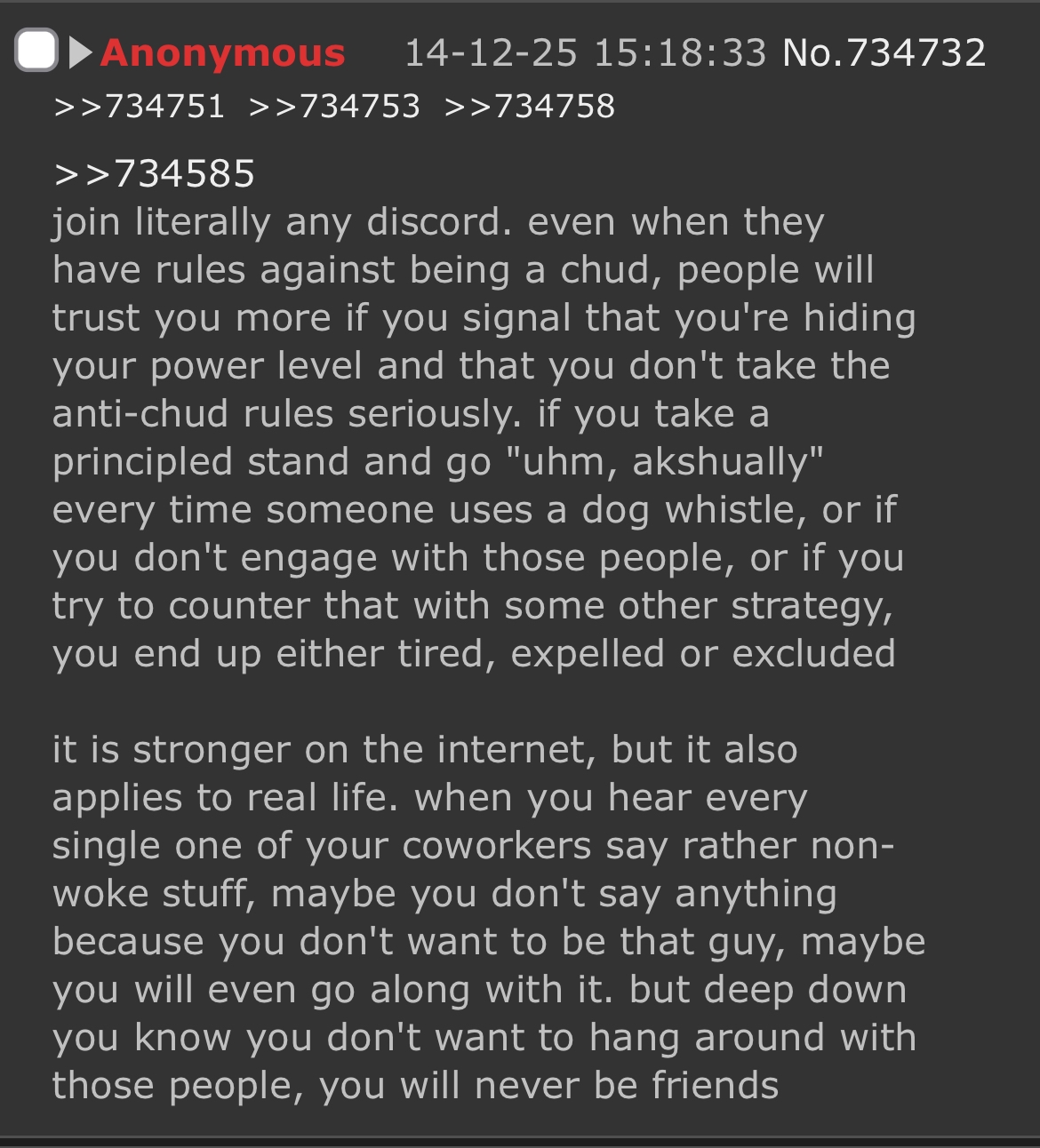 >>909089 >и друг перед другом. Кстати очень интересный момент. Бывает такой общаешься лампово в ламповом треде. И тут внезапно в обычном посте твоём проскакивает какое то слово, за которое цепляется другой анон с совершенно нерелейтед темой и предъявой к этому слову. Ты в этот момент отвлекаешься минут на 10, возвращаешься, а там уже нерелейтед срач на сотню постов, всё из-за слова триггера. Вот и думай, боты между собой насрали, или шизы набежали.