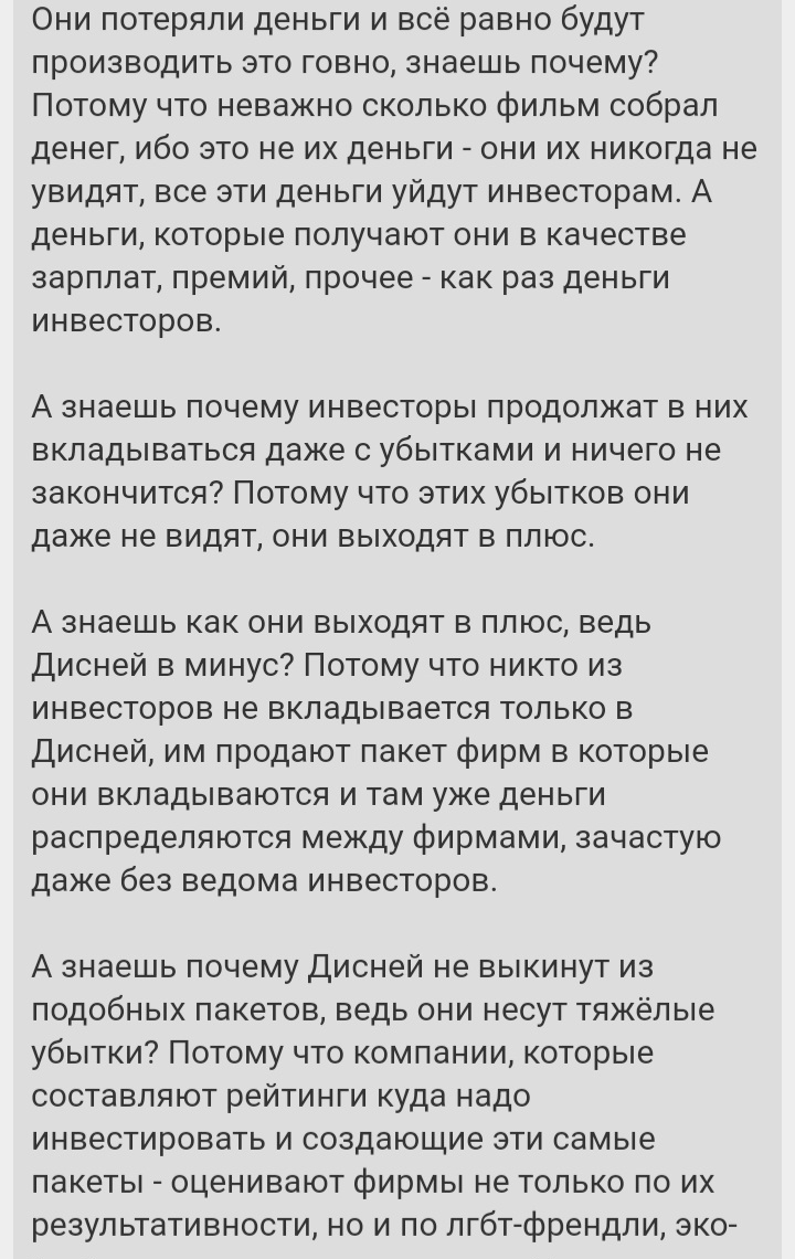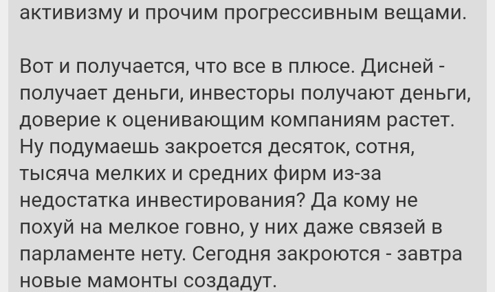 >Все двачеры, которые прочитают эту переписку, встанут на мою сторону т.к. Т.к. ты умело разбрасываешься популистскими баззвордами, за которыми ничего нет. Давишь на фантомные боли о былом славном интернете и ностальгию, умело подменяя причины и следствия, утверждая, что вот если сделаем Х, то всё будет как раньше. Примерно как современные комуняки промывают дедам голову, что вот сделаем Х и заживём как советском союзе, вы же помните как хорошо было в советском союзе, воот. Современные абсурдные запреты из-за военного времени в локальной россиюшке никакого отношения не имеют к общему глобальному урегулированию интернета. Как и теме этого треда. Иоя же сторона, просто рассуждает "а как быть"? Потому что я не считаю, что полная свобода приведёт к какому либо положительному эффекту, и уж точно не будет как раньше. И поэтому я изначально задался вопросом "А как иначе?" Твой вариант я услышал, с полным отрешением от реальности и перманентной дрочкой на гуро и копро. Мне такой вариант не нравится.