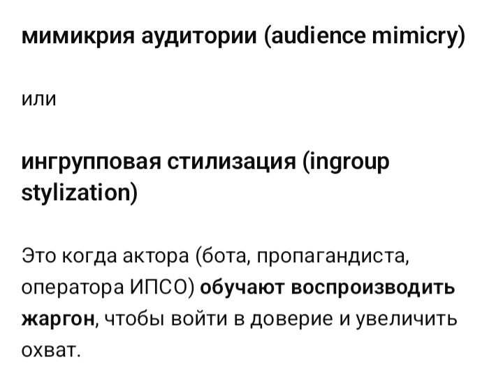 >>904028 1.Были сообщения о якобы АИ ботах, которые ведут дискуссию и отстаивают политическую позицию Трампа. И вот был скриншот, где вместо сообщения вылазит ошибка, на русском, что вы аккаунт не оплатили. Но это может быть фейк дем партии с целью легкой дискредитации и подчеркивания связи с рф. 2. Лет 6 назад, на реддите выпустили АИ бота, который обучался на всех постах всех пользователей. Каптчу решали за него платно. Возможно даже я говорил с ним. Его было невозможно отличить от обычного постера. Но он не отстаивал глобально ничью позицию, а просто обсирал постящего какое-то утверждение, или наоборот поддерживал, триггерился. Но это было годы назад. Был конкретный ввод данных от всех постеров за годы в архиве и было мимикрирование под них. Сейчас, якобы большие языковые модели знают вообще всё и могут принять нужную роль. Вот только на чем им учиться? Не будет ли их аргументация инфантильной, а главное глобальная позиция то может колебаться по какому-то вопросу. Это очень рискованно запускать такую машину в поле. Тем более что без людей инфлюенсеров не обойтись, всяких блоггеров ломов, которые показывают свое лицо. 3. В отличие от АИ, сведения о фабрике постеров вроде бы появлялись регулярно. Т.е. зачем менять что работает. >Какие ещё агенты? Понятия не имею как они там организованы, но я уверен что мочер в вм триггерится на определенные слова и высказывания. Значит он имеет указания, что пропускать можно, а что нельзя. Как в эфир телевизора, только лайтово. Постеры: появляются специальные провокаторы, которые байтят агитацией за совок. Новостные постеры, которые ищут что бы вбросить. Постеры которые срут боевыми картинками. Им противостоят такие же с другой стороны. Там тоже вбросы нового события, перекрытия плохих событий. Ломы. Ты смотрел недавнюю запись со стрима мэдисона, поищи, называется мэдисон жестко ответил светову. Он рассказывает там, внезапно, как раз об этом. И вот если смотреть ломов, то можно заметить, сходства в определенных тезисах, а можно наоборот вдруг обнаружить отличия. Это значит у них схожие или различные источники.