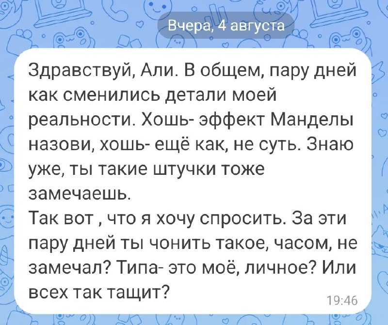 > § Я допускаю, что часть читателей канала сейчас проходят трудные времена, когда рушится то, к чему они привыкли, перестают работать старые способы зарабатывания денег, утрачиваются какие-то способности, теряются документы, внезапные автокатастрофы и инциденты. Но также могут происходить и хорошие вещи. Почему? Потому прошлое переписывается, следовательно резко сворачиваются событийные ряды, основанные на том, старом прошлом. Эффект Бабочки, если хотите.
