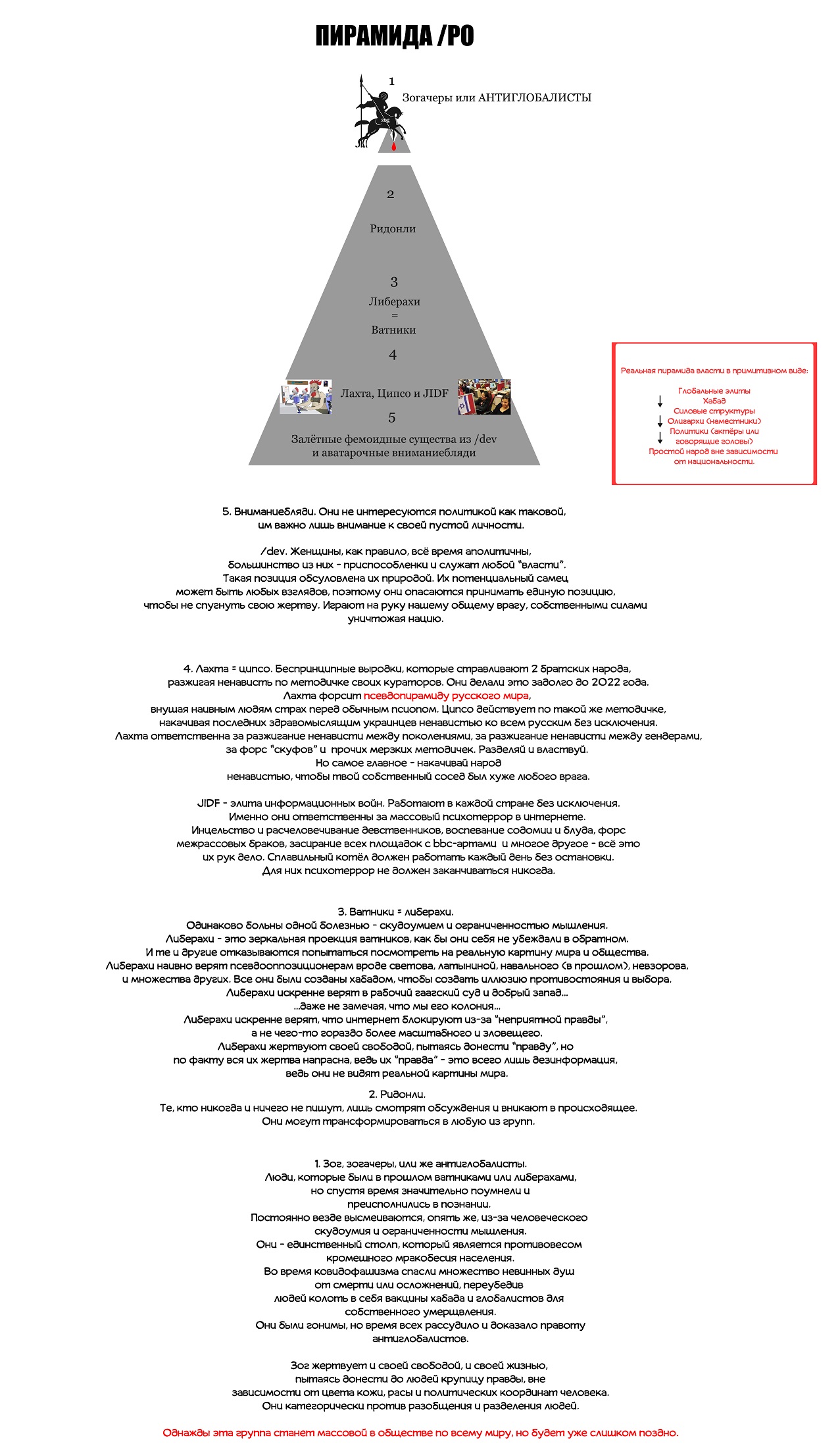Анон >>907472 дело говорит. Ты под присмотром правительства и это главное. Твои идеи и то во что ты веришь не столь важны. Пока ты не залупаешься на власть имущих, власти до тебя дела нет. Но я не за этим сюда пришел. Последнее время мне активно пытаются на ютубе рекомендовать штефанова. Я вообще не смотрю русскоязычный полит-контент, только игры иногда поглядываю. Но это ничтожество суют во все щели, очередного борца с системой продвигают. Те выродки что вылезли из проекта спасибо ева - устарели, некоторым сороковник пошел. Теперь новых нам подсовывают помоложе. Не пора ли обновить наши базы? >>905749 Я так же хочу обратить внимание что темы которые тут поднимаются, не только в зог, но и в политаче, не имеют никакого отношения к реальности. Например борьба левочков с провачками. Леберасты VS зетники. Белая нация против исламизации. Я никогда не слышал чтобы люди вокруг меня, будь то мои друзья или родственники называли себя белыми, зетниками или правыми. Какая-то ложная дихотомия, попытка классифицировать людей, а потом загонять их в рамки и определенное мышление которое соответствует исключительно их повестке. Мол, если ты не хочешь войны, ты также должен хотеть чтобы все русские сдохли и лишились своей земли. Или если тебе не нравится путин, то мы должны вступить в европейский союз и жить под пятой брюсселя. Как будто бы ничего их этого просто не имеет смысла. Как можно от ненависти к путину перейти к тому чтобы желать уничтожение собственной страны? Только если ты не маргинал, истерик и психопат который по причине своей невменяемости оказался с себе подобными на этой доске. Единственное что меня успокаивает, так это то что я оказался здесь из-за игр и аниме. Плюс мне было за 20 когда я попал сюда и я уже был сформирован более менее нормальными людьми. Тут есть люди которые сидят тут с 12 лет. Вот их мозги действительно сломаны.