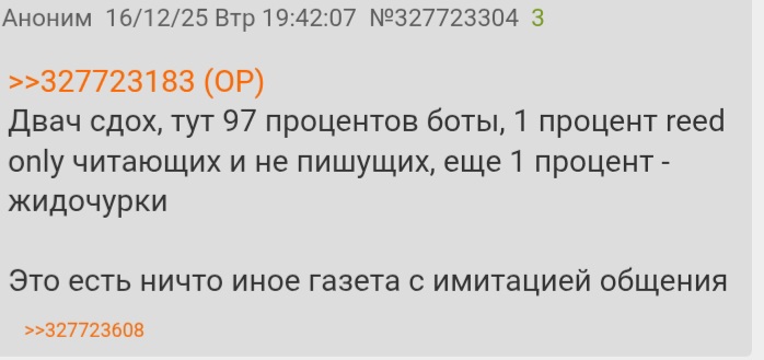 мой вердикт- двач это имитация, я не вижу постов от интересных анонов вообще. и не вижу реакции на мои интересные посты, кроме банальщины или это нейросетки.