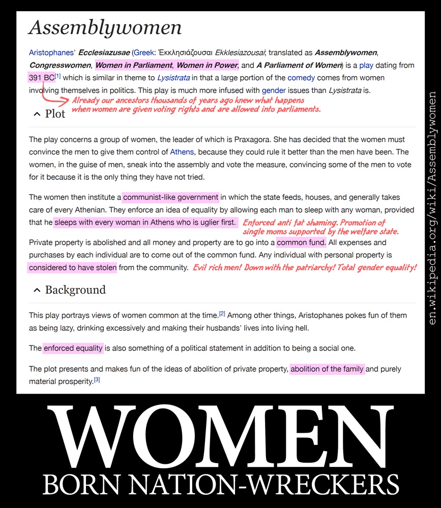 "Феминизм - это наше изобретение по двум причинам: Раньше только половина населения платила налоги,