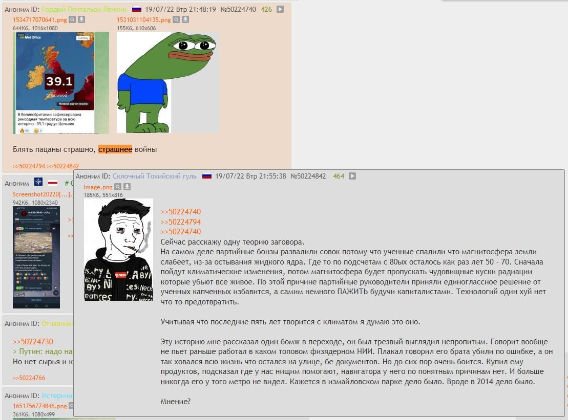 >>914622 Вооот! Для меня вообще странно, что люди не замечают, что сидишь на улице под солнцем, жарко до невозможности, стоит солнцу зайти за облако или самому зайти в тень, уже холодно, что куртку накинуть хочется. Ну, и у людей прям над головой летают самолеты с химтрейлами, которые превращаются в дымку и даже пленку над небом, но всем пофиг, все хохочут над конспирологами и обсуждают какой-нибудь ковид, который одним днем закончился, и одни и те же новости про войнушки и бесконечные санкции и разборки звезд, политиков и прочих клоунов.