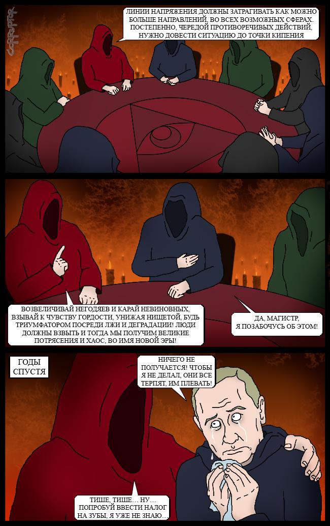 Не смотря на крестовый поход против "мирового правительства" - реальные кукловоды останутся нетронутыми, потому как действуют намного выше. На растерзание толпы будут отданы лишь слепые слуги, так называемые козлы отпущения. Пойманные на властолюбии, они были убеждены, что являются неприкасаемыми и будут иметь крепкую власть в низших конфигурациях (например, технократический контроль над миром в бездуховном материализме).