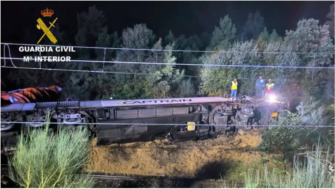 Грузовой поезд сошёл с рельсов в Ас Невес, в северном испанском регионе Галисия, после того, как оползень заблокировал путь, в результате чего водитель получил травмы, а 9 вагонов перевернулись.