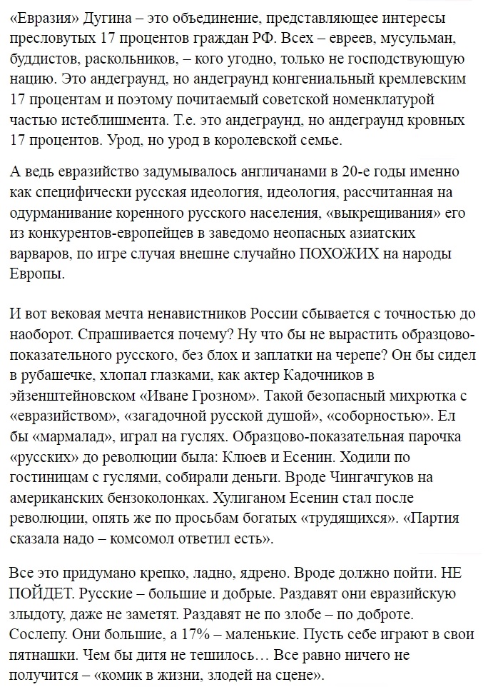 Сегодняшние поклонники романовской русскости это совершенно бессмысленные и озлобленные существа, помешанные на неонацизме. У них нет мировоззрения. Одни только припадки о том, что им мешает жить 282 статья УК РФ.