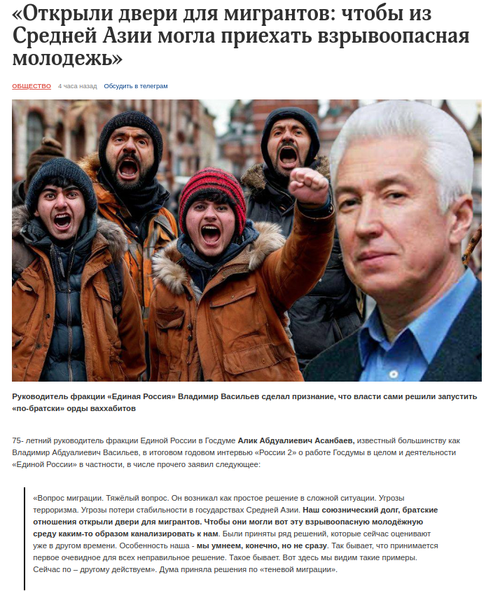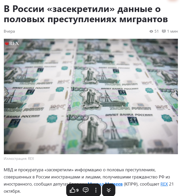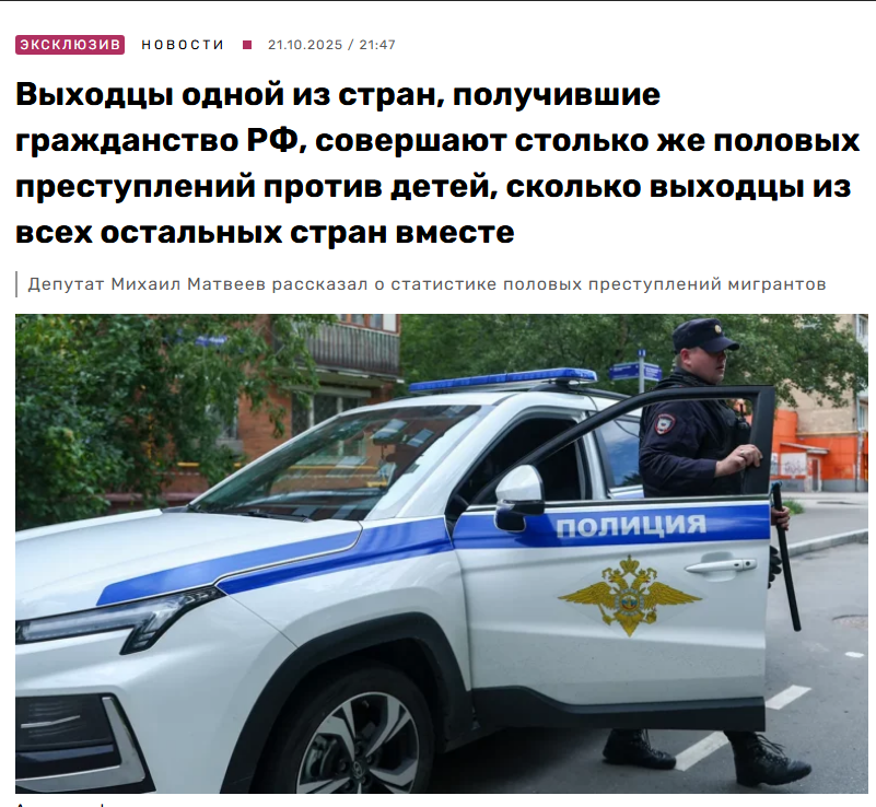 >>943243 Громкие хуцпистые заголовки, чтобы отвлечь людей от реальных проблем https://amp.rbc.ru/rbcnews/society/03/06/2025/68399efe9a79470cd5b567a5 > В таком случае получается, что число осужденных россиян — 1,3 тыс. на 100 тыс. человек, а иностранцев — 507 на 100 тыс. >Как отмечено в исследовании, нет принципиального различия в преступлениях, которые совершают россияне и иностранцы: значительную часть приговоров и тем и другим выносят за кражи, наркотики и нарушения правил дорожного движения. Среди 15 статей, по которым чаще всего судят иностранцев, из насильственных есть причинение тяжких телесных повреждений — оно на 13-м месте. >Иностранцев судят чаще граждан России за изготовление и использование поддельных документов (ст. 327 УК) и незаконное пересечение границы (ст. 322 УК). Мигранты такие же люди и нет какого-то лютого разрыва в преступлениях между ними и коренными жителями (и то он в пользу самих мигрантов). И я напоминаю, что им в оправдание идет тот факт, что они выходцы из нищих аулов в которых ничего небыло кроме корана - для таких условий их уровень преступлений довольно таки низок