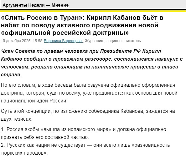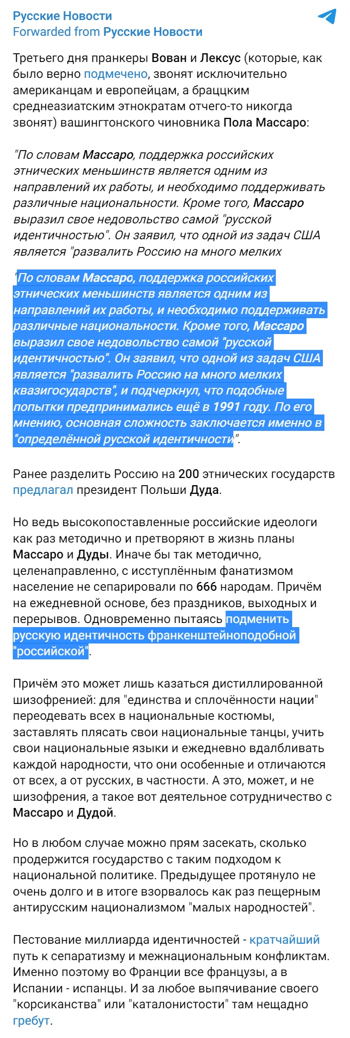 Рос.гос.скреп.надзор.пропаганда (по сути своей агенты-вредители) давно пытается дерусифицироть Россию, рассказывая что сказки у нас не ''русские народные'',а ''сказки народов России'' или пытается внушать населению что русская культура это балалайка, матрёшка и мужичок в косоворотке с бутылкой водки. Или ещё хлеще, якобы русскость и русские традиционные ценности это оказывается евразийство, сталинизм, вождизм, коллективизм, мультикультурализм, чучхеизм и прочее в том же духе. И аборты детей, которые нынешняя номенклатура бережно сохраняет... видимо аборты в их представлении это тоже традиционные ценности