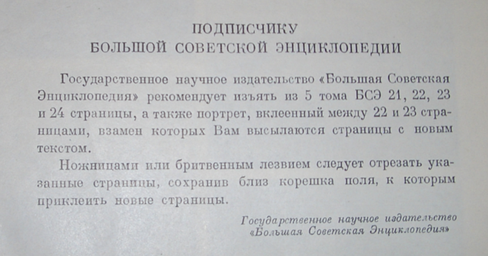 >>929894 "В 1954 году редакция Большой советской энциклопедии разослала всем своим подписчикам письмо, в котором рекомендовалось «ножницами или бритвенным лезвием» вырезать и портрет, и страницы, посвящённые Л. П. Берии, а вместо них вклеить другие (присланные в том же письме), содержащие другие статьи, начинающиеся на те же буквы."