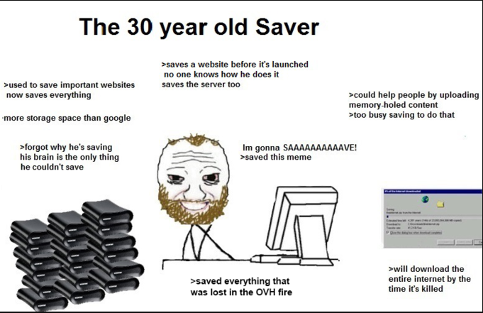 >Что сохранять Архив флибусты Архив рутрекера и порнолаба(если он есть) Дамп старой лурки Набор выживальщика Гк Инвок пак с картинками в треде пятибрата в треде линки https://web.archive.org/web/20231218025247/https://2ch.hk/zog/res/692745.html Лекции коб, перезаливы нестора для общего развития Архив выживальщика Райан Норт - Создай цивилизацию с нуля Материалы по иностранным языкам, не ток по инглишу И т.д.
