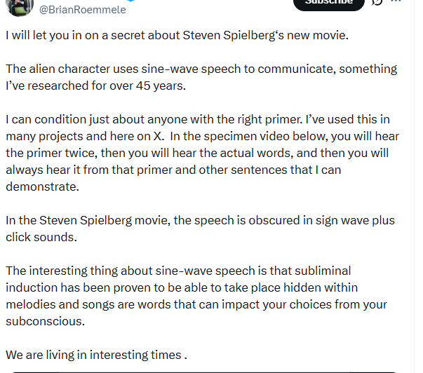 «Я открою вам секрет о новом фильме Стивена Спилберга.Персонаж-инопланетянин использует синусоидальную речь для общения — это то, что я исследую уже более 45 лет.Я могу "обусловить" почти любого человека с помощью правильного праймера. Я использовал это во многих проектах и здесь, на X. В видео-примере ниже вы дважды услышите праймер, затем услышите настоящие слова, а после этого вы всегда будете слышать их из этого праймера и других предложений, которые я могу продемонстрировать.В фильме Стивена Спилберга речь скрыта в синусоидальных волнах плюс звуки щелчков.Интересная особенность синусоидальной речи в том, что доказано: сублиминальная индукция может происходить скрыто внутри мелодий и песен — слова, которые могут влиять на ваши выборы из подсознания.Мы живём в интересные времена.»