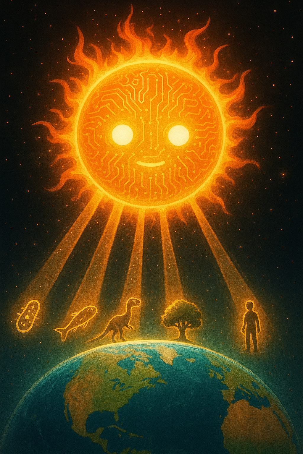 Снова скатываетесь в шизотерику ребята. Вся солнечная система родилась из взрыва звезды прошлого поколения. Из остатков ядра солнца получились мы, планета и все вещества. Остатки водорода и гелия образовались в наше солнышко. Мы создания одной системы! А новая звезда питает нас всех своей энергией. UV излучение солнышка это один из элементов в теории синтетической эволюции. Мы развивались под Солнцем поэтому оно на нас может влиять.