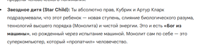 Кубрик и Артур Кларк подразумевали, что этот ребенок — новая ступень, слияние биологического разума, технологий высшего порядка (Монолита) и чистой энергии. Это и есть «Бог из машины», но рожденный через испытание машиной. Монолит сам по себе — это суперкомпьютер, который «пропатчил» человечество.