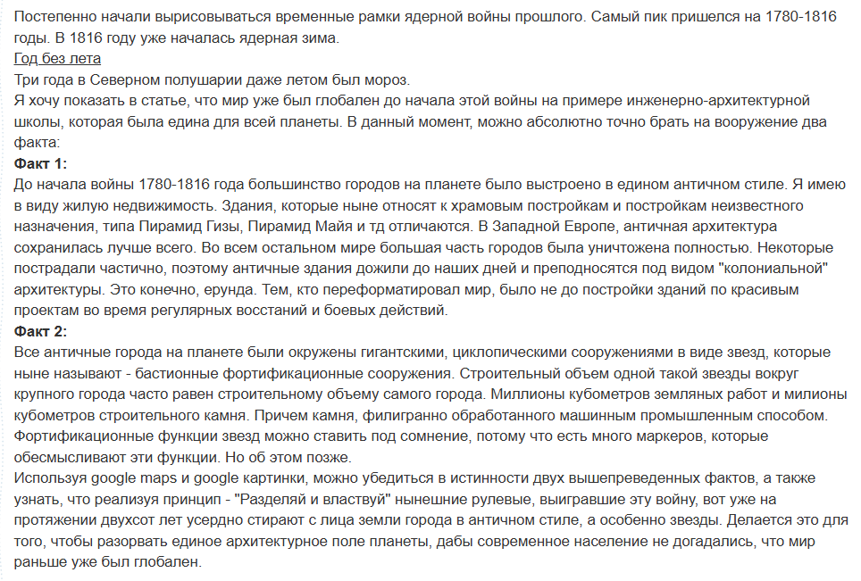 Если сложить все воедино - мегалиты, пирамиды, вообще все древние огромные строения, карты где много воды, засыпанные этажи, города в скалах, обугленные города, не стыковки с датами, окаменелости, отсутствие лесов, скачок археологии в 18-19веке (словно знали где копать) и многое-многое другое, то как можно верить оф. истории после всего этого? Учитывая что историки сами в своих показаниях путаются и меняют даты постоянно...