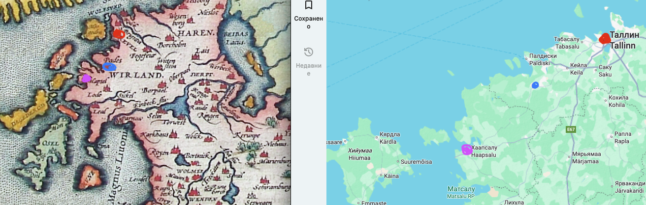 1. Куда острова пропали? Вероятно сейчас они часть суши. Куда реки пропали? 2. Где суша которая есть сейчас? Падизе (синий) был вообще прям у моря, а рядом с таллинном (красный) был большой остров, который сейчас суша.