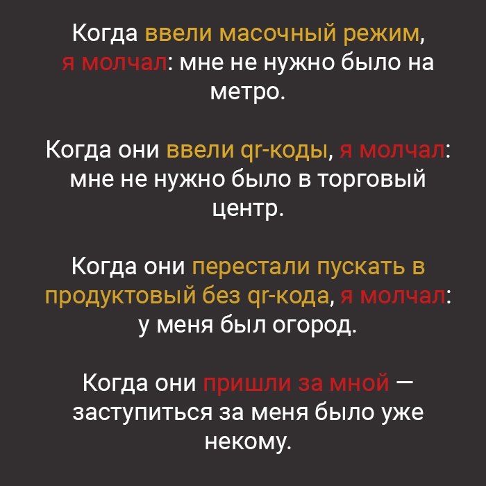 >>933735 (OP) Я помню. Помню как пыжился, дёргался, читал Зогач... а потом, когда припёрли лишением материальных благ в виде хорошей получки и увольнением поставился шмурдяком. Переживал, что предал Людей и себя. А потом получил бумажку с куаркодом, Метку Зверя, и сразу легче стало, отрёкся от Бога окончательно. И вот нет мне радости, просто существую и жду смерти.