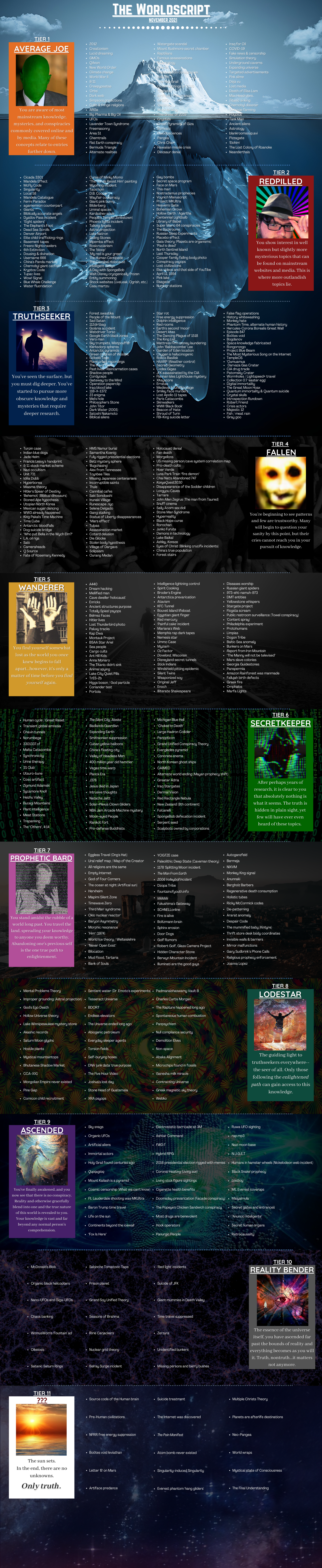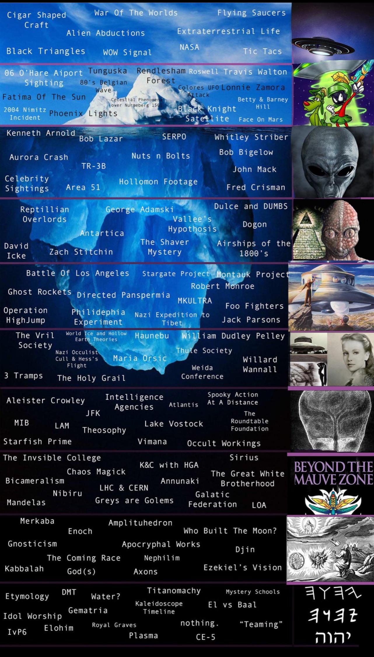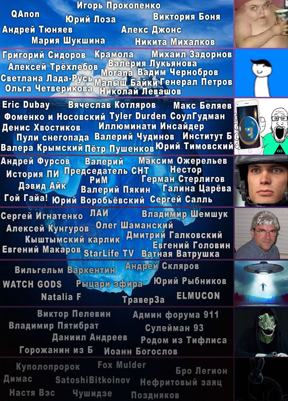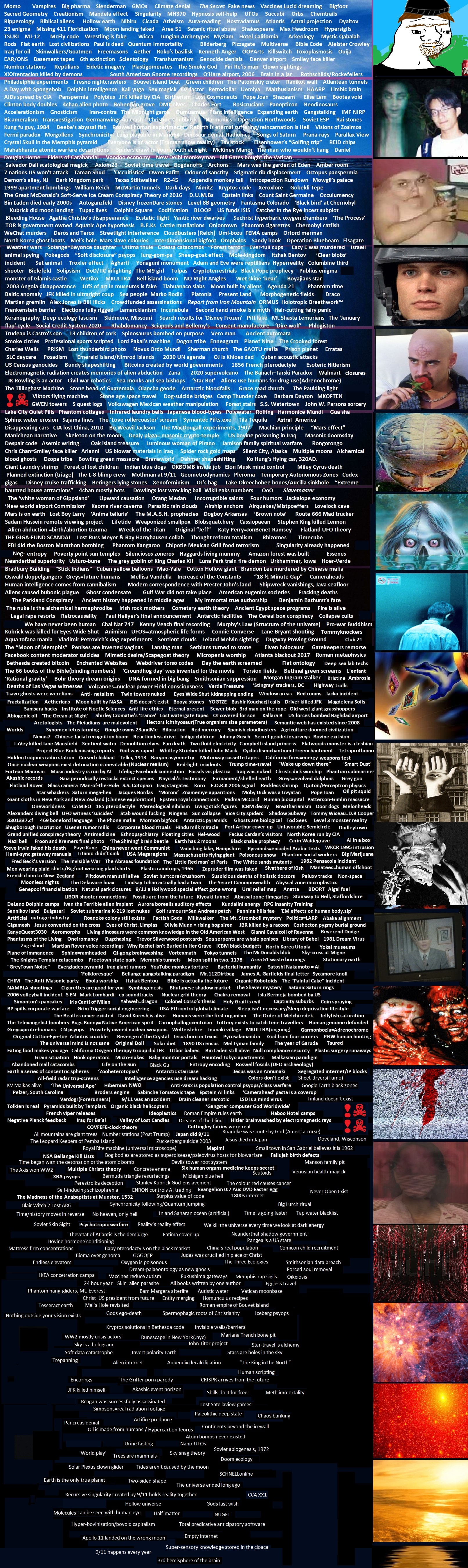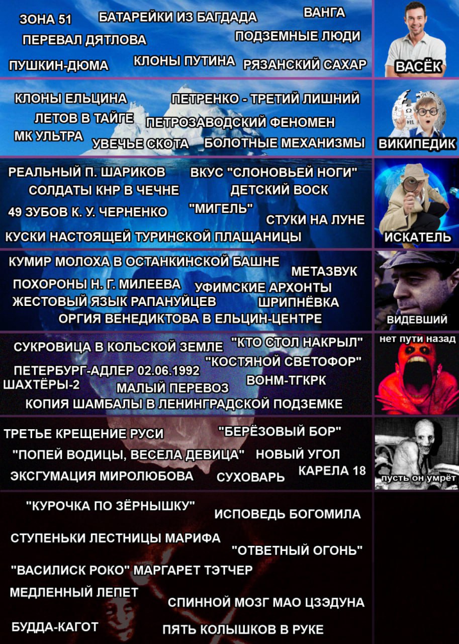 - мир это матрица или иная симуляция - глюки в матрице - нло - пиццагейт - полая Земля - плоская Земля - сотовая Земля - масоны - тайные ордены - эффект Манделы - потопы, засыпанные города - Тартария - оккультизм среди элит - альтернативные источники энергии - земля это ферма, выкачка гавваха - рептилоиды - инсектоиды - Атлантида, Гиперборея, Лемурия - НПЦ - убитые прошлые цивилизации - теория мёртвого интернета - умышленное устаревание техники - остров Эпштейна - культ куба Сатурна - официальная история не верна - аденохром - МК ультра - ЦЕРН - аэропорт в Дэнвере - ритуал переселения души от умершего в младенца - пситеррор - РФ и Китай и другие страны криптоколонии западных стран - ядерные войны 19 века - кыштымский карлик - перевал Дятлова - 9/11 - убийство Дж.Кеннеди - замещение белого населения на Западе - Бриджит Макрон - мужик - космос - это обман - смерть принцессы Дианы - убийства учёных - химтрейлеры - Джонни Депп - сатанист (движение признанное экстремистским) - скрижали Джорджии - карточная игра Иллюминаты - американцы не были на Луне - Зона 51, где разбился НЛО - люди созданы инопланетянами - Шекспир не писал свои книги - мировое правительство - обложка The Economist - вирус ковида был создан в лаборатории - Есенин убит чекистами - художник Константин Васильев был убит - Янку Дягилеву убили - мавзолей Ленина - престол оккультных сил - Петра 1 подменили в Голландии - вскрытие могилы Тамерлана - начало советско-немецкой войны - Пелевин помимо вымысла в своих книгах пишет про реально существующую мистику и политику - Кирсан Илюмжинов был похищен инопланетянами - криптозоология - подлодку Курск подбила американская подлодка