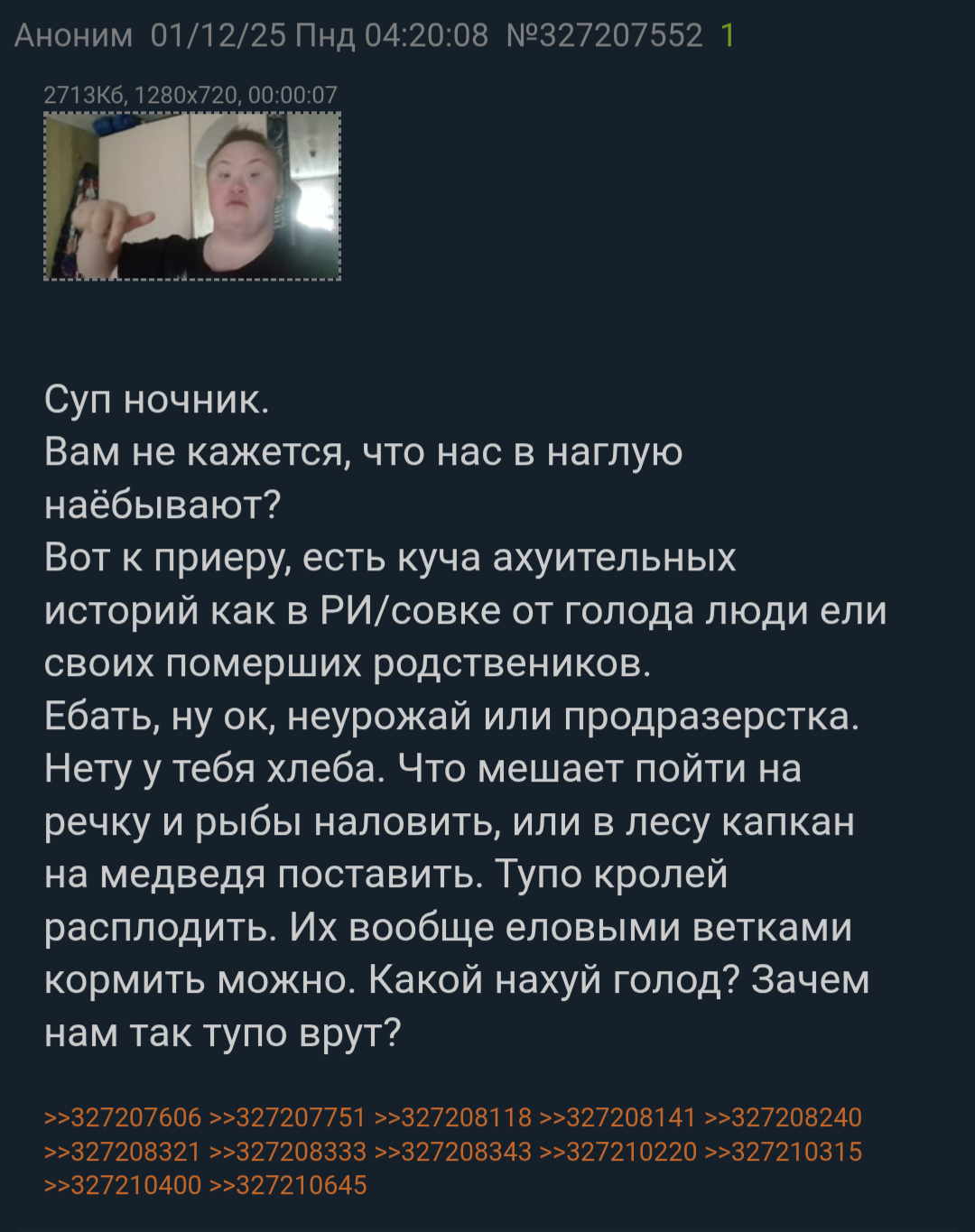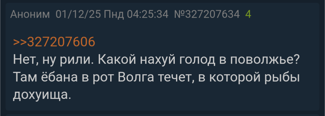 >>936969 (OP) >Как можно просто умерать с голода? Дело в том колхозник сначала работал в колхозе ему ставили трудодни и получали ни чего. Потом они еще пахали на своем огороде вот на это они надеясь выжить, но комми и это отобрали . А уже зимой ты грибов не насобираешь . Много не на рыбачишь, не везде есть достаточно рыбы и водоёмы. Вот и помирали.