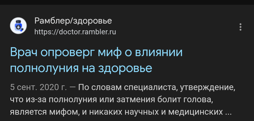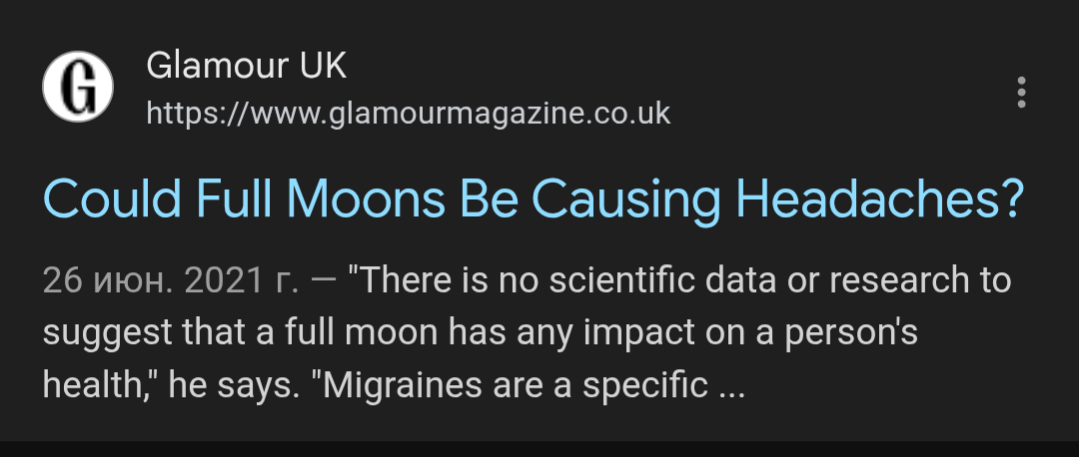 Вчера я специально смотрел атмосферное давление в своем регионе, смотрел магнитные бури, смотрел перепады температуры. Все было окей, не было никаких перепадов. Но ебашило люто. Я даже не знал сначала, что полнолуние, меня просто мигренило. Я искал объяснение и поэтому сначала посмотрел магнитные бури и атмосферные перепады. Потом посмотрел в окно и все сталр на свои места. Меня всегда кроет именно в полнолуние, даже если я и не в курсе что оно будет. Я за фазами луны не слежу специально.