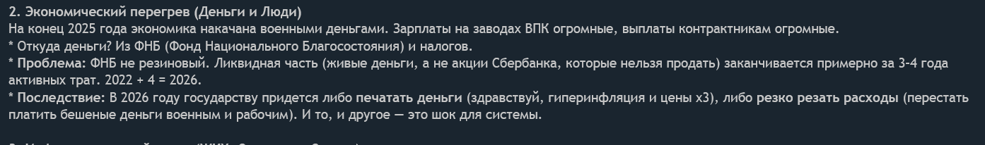 2. Экономический перегрев (Деньги и Люди) На конец 2025 года экономика накачана военными деньгами. Зарплаты на заводах ВПК огромные, выплаты контрактникам огромные. * Откуда деньги? Из ФНБ (Фонд Национального Благосостояния) и налогов. * Проблема: ФНБ не резиновый. Ликвидная часть (живые деньги, а не акции Сбербанка, которые нельзя продать) заканчивается примерно за 3–4 года активных трат. 2022 + 4 = 2026. * Последствие: В 2026 году государству придется либо печатать деньги (здравствуй, гиперинфляция и цены х3), либо резко резать расходы (перестать платить бешеные деньги военным и рабочим). И то, и другое — это шок для системы.