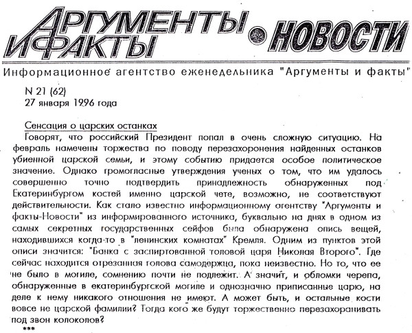 Короче, кроме убедительных показаний Родзинского, Никулина, рассказов Юровского, верить особо-то нечему. Начиная с 1980-ых гг. с костями начались странности, и более менее складной информации по теме с тех пор уже нет и вряд-ли больше будет.
