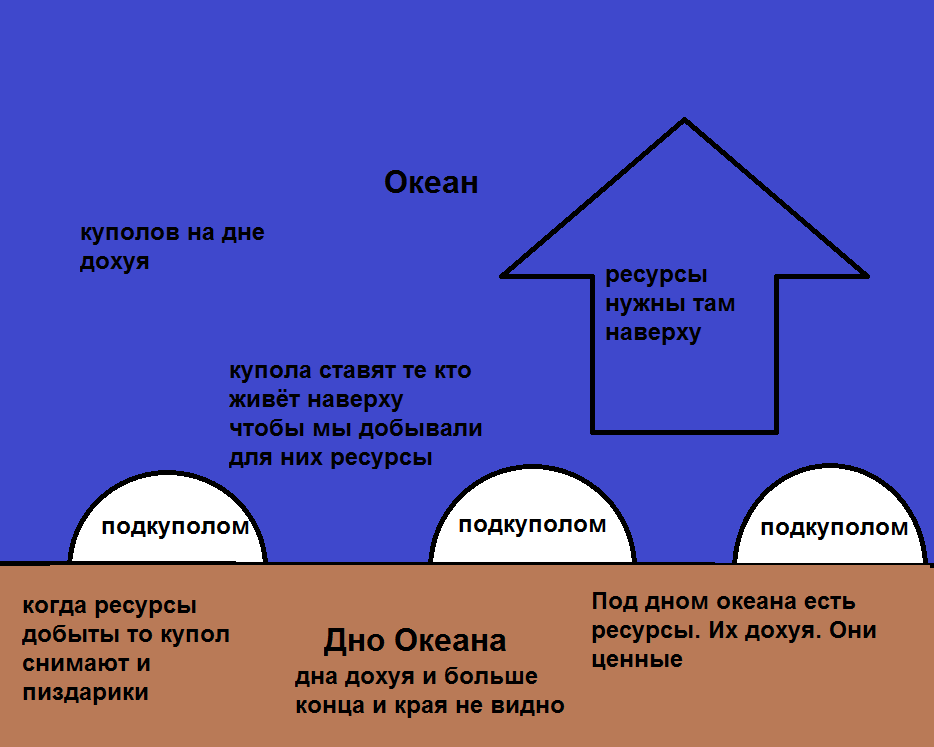 >>943869 ты полную хуйню снёс. откуда ты знаешь нахуя развитой цивилизации нужны обычные ресурсы? Ну мало ли, руда, золото, серебро, никель, цинк и прочая хуйня. Схуяли ты решил, что им это не нужно? Откуда ты можешь знать что им нужно, а что им не нужно? Купол может быть сделан из материала который они замутили на поверхности океана, вай нот. Или может они добыли этот материал из метеорита которые в реальном космосе летают? Купол может быть из прозрачного сверхпрочного аналога резины который они тупо на заводе из цистерны выдавили и пиздец. Суть одна - мы не знаем.