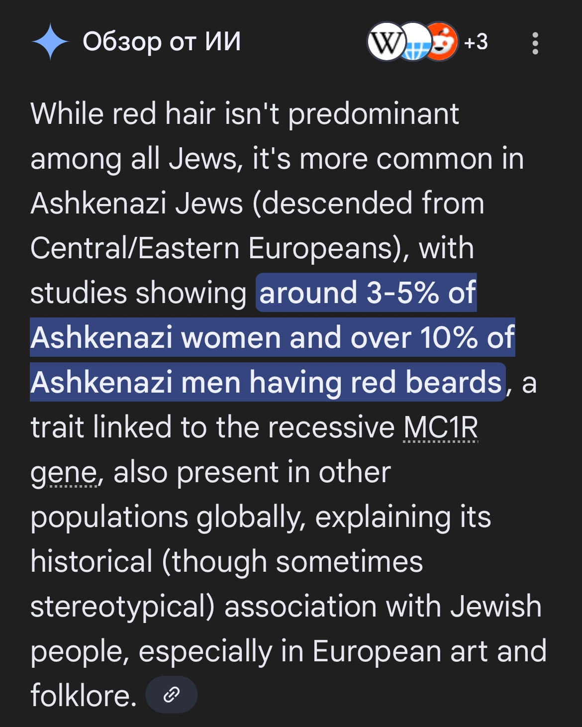 >>945322 (OP) в России и Галиции в конце XIX века наблюдалась самая высокая концентрация рыжих евреев, а сейчас до 4-5% ашкеназов имеют рыжие волосы, при этом рыжая борода чаще встречается у мужчин, независимо от цвета волос на голове. Ашкенази: Около 4-5% ашкеназских евреев имеют рыжие волосы. Генофонд: У ашкеназов светлые волосы (включая рыжие) встречаются чаще, чем у сефардов или мизрахов (10-30% против 10% и 2% соответственно), но ниже, чем у других северных европейцев. Исторический пик: Наибольшая концентрация рыжих евреев была зафиксирована в Российской империи и Галиции. Рыжие бороды: Примерно 10% еврейских мужчин имеют рыжие бороды, даже если волосы на голове другого цвета.