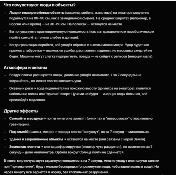 > исчезнет гравитация на 7 секунд От потери гравитации рухнут все бетонные здания, нужно будет прятаться в деревянных домах и землянках, готовиться к краху инфраструктуры и впринципе полному пиздецу.
