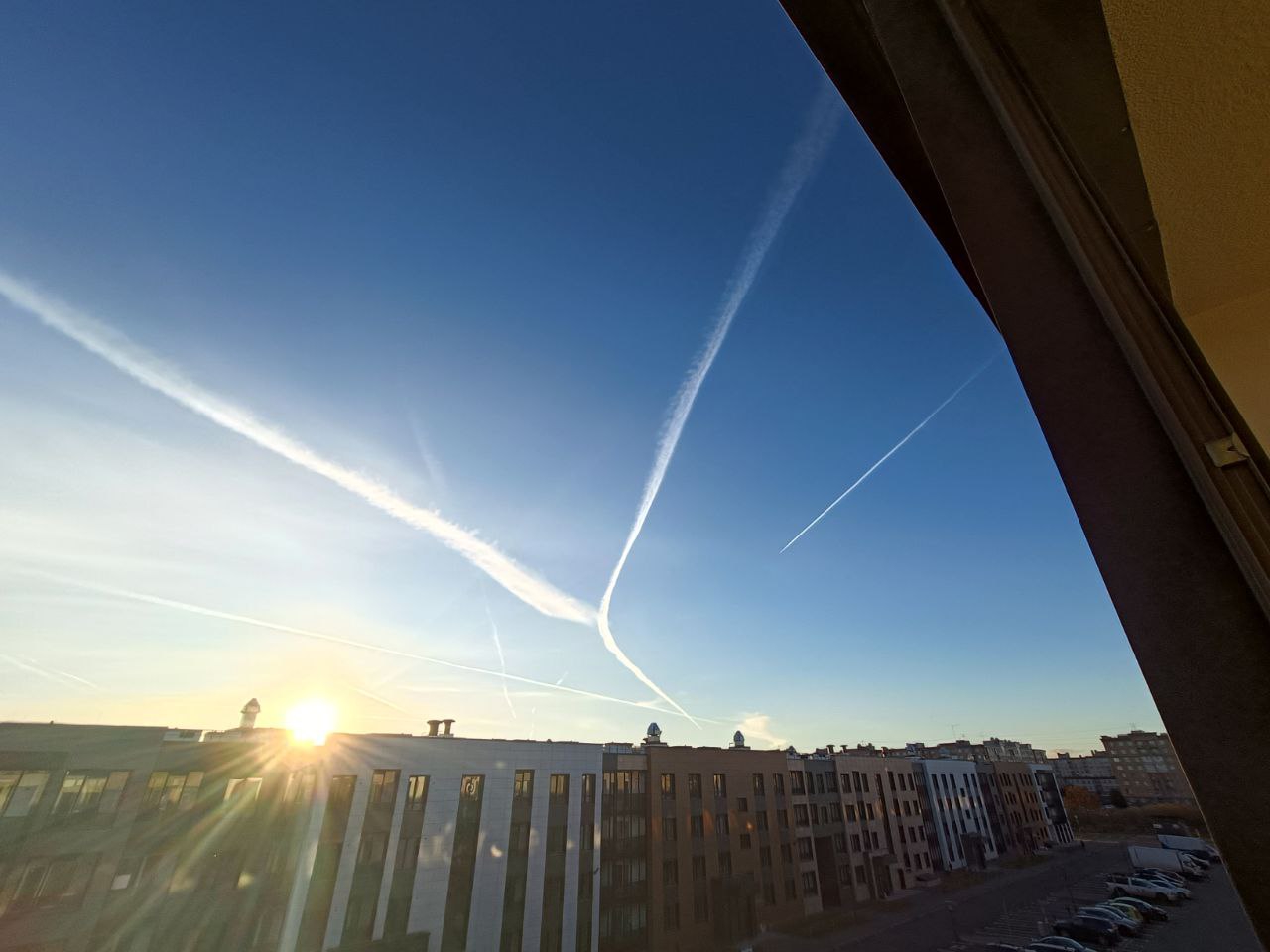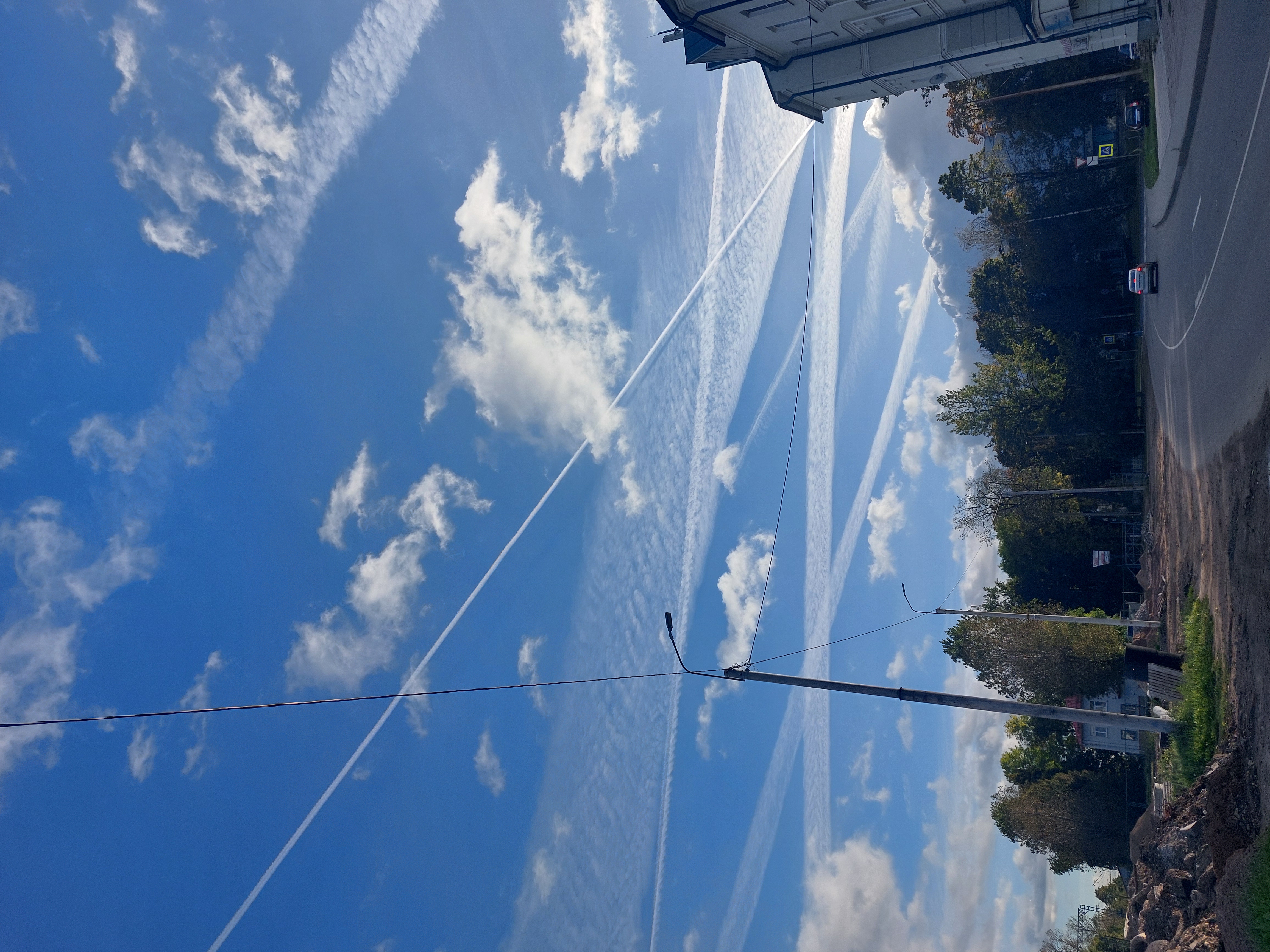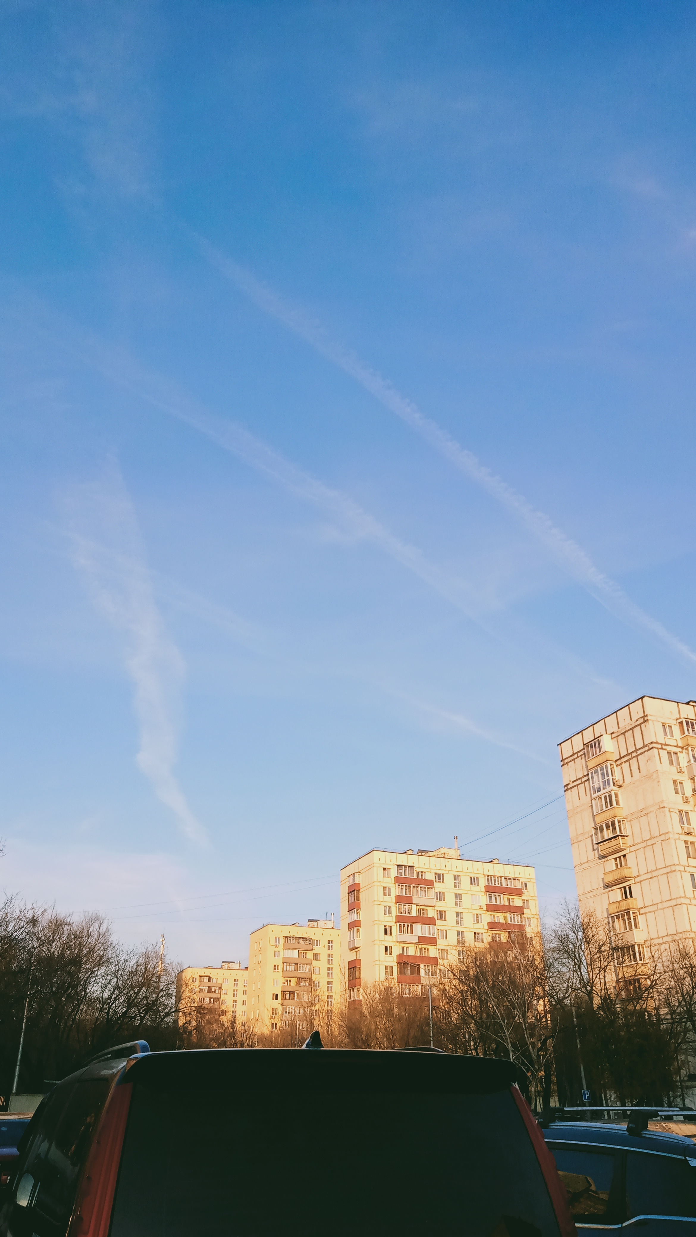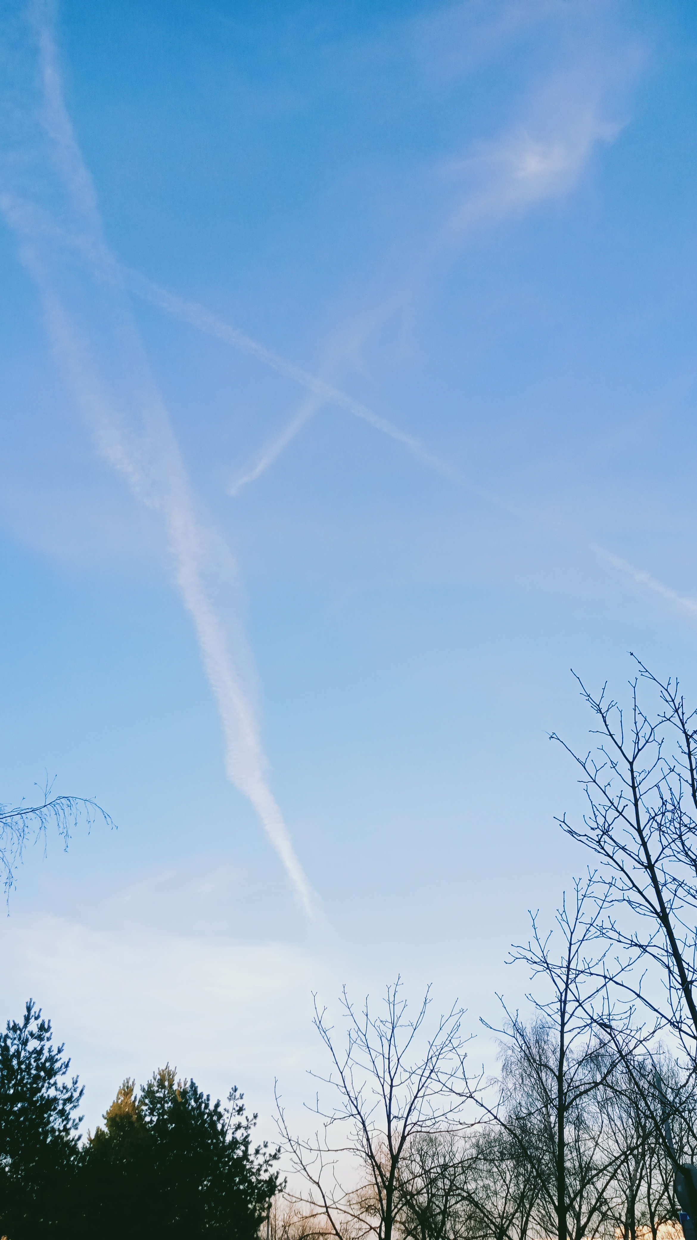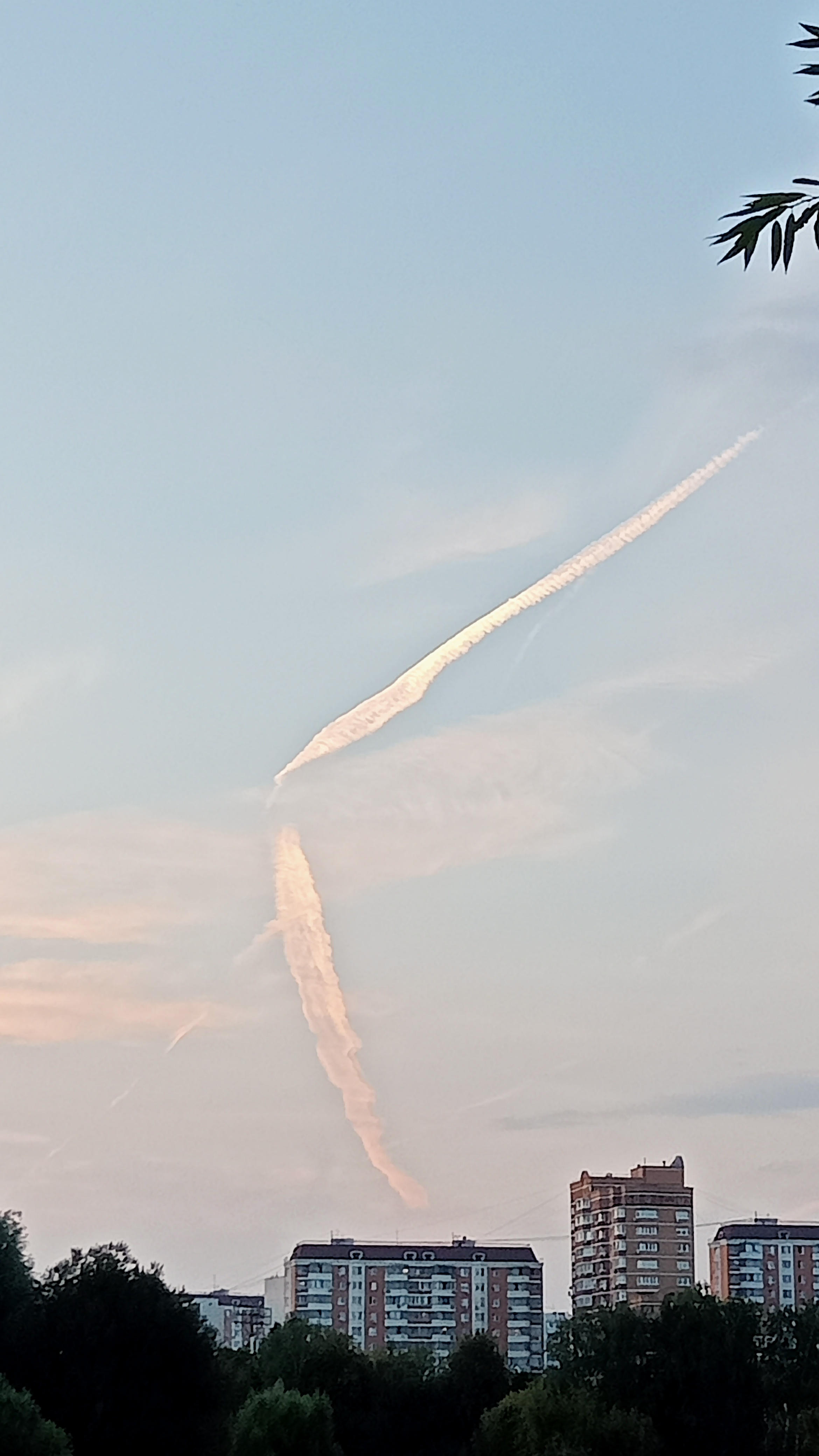 Объясни местным шизам почему химтрейлы – хуйня. Химтрейлы это просто конденсационные следы от турбин самолётов, пар вылетает, на высоте 10+ км где -50 и низкое давление он мгновенно замерзает в кристаллы льда и висит пока не испарится. Если воздух сухой - следы короткие и быстро тают, влажный - растягиваются на километры и держатся часами, формируя эти "сетки". Всё проверено метеоучеными с 40-х годов, фото с земли обманывают перспективой, самолёты летают на разных высотах и коридорах.