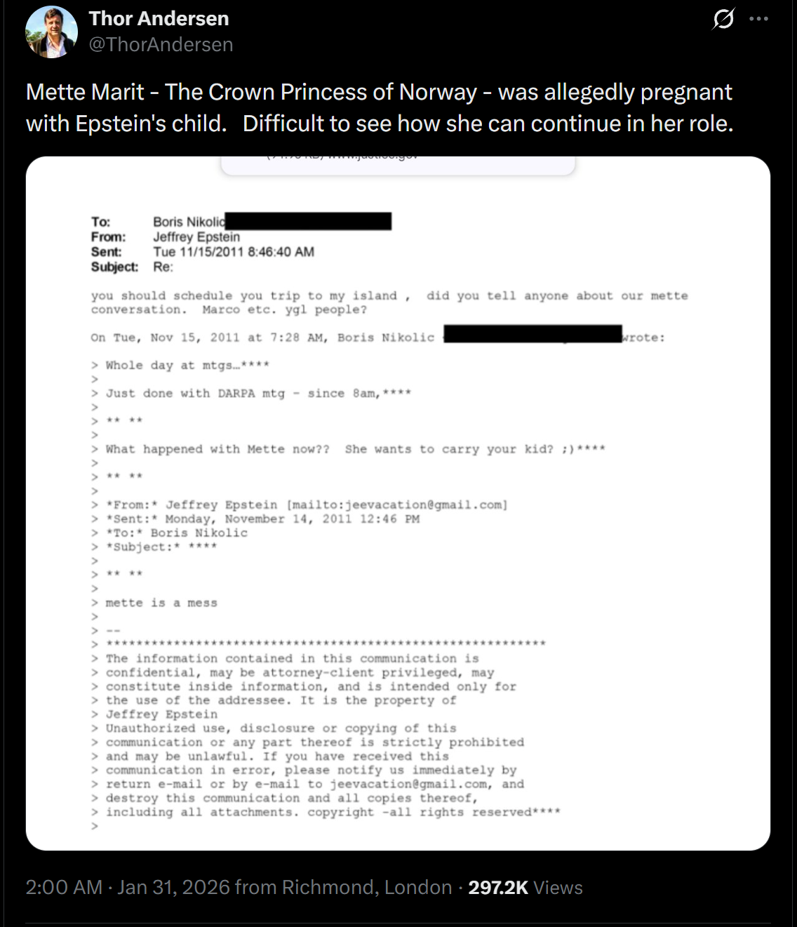 Сегодня гремят советник по нацбезопасности и бывший министр иностранных дел в Словакии Лайчак, которого собирались сделать президентом. Переписка БиллГейтса с Эпштейном о моделировании пандемии в 2017 году. В Великобритании новая ступень скандалов с королевской семьёй. В Норвегии тоже королевская семья с принцем-шаманом, уголовными делами и заявлениями, что всё что было раньше ерунда на фоне файлов Эпштейна. В файлах уже всплыли обсуждения получения к замороженным активам Ливии при помощи еврейской и британской разведок. Параллельно при публикации на днях всплыли личные данные десятков женщин, включая адреса и они уже подвергаются травле. Маск на упреждение уже объявил себя главным защитником детей, которого сейчас будут очернять, а он будет терпеть невыносимую боль обвинений.