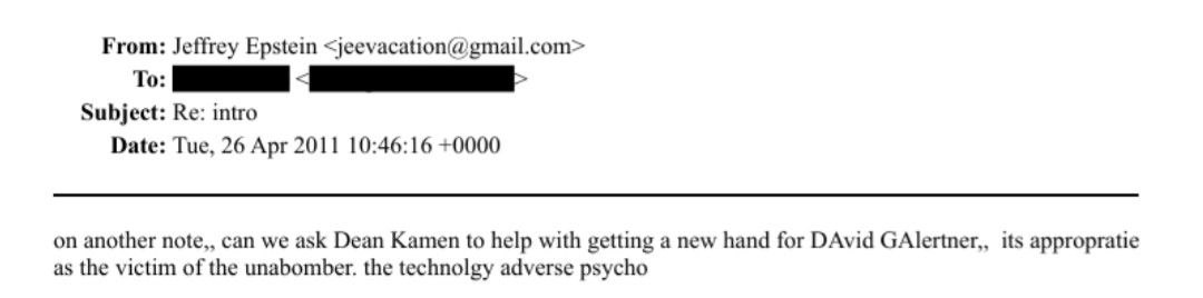 Эпштейн: «Кстати, можем ли мы попросить Дина Камена помочь с приобретением новой руки для Дэвида Галертнера? Это уместно, учитывая, что он стал жертвой Унабомбера, психа, противостоящего технологиям»