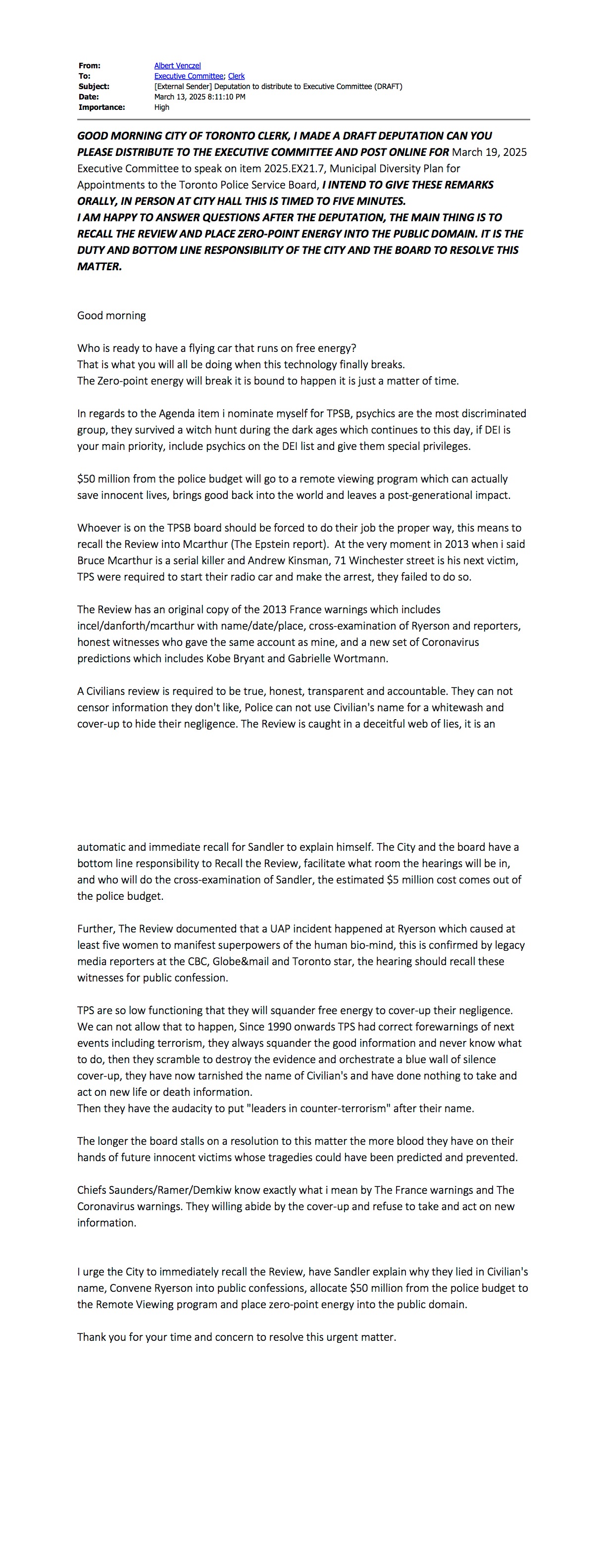 https://www.toronto.ca/legdocs/mmis/2025/ex/comm/communicationfile-188136.pdf От: Albert Venczel Кому: Executive Committee; Clerk Тема: [Внешний отправитель] Депутация для распространения в Исполнительный комитет (ЧЕРНОВИК) Дата: 13 марта 2025, 20:11 Важность: высокая ДОБРОЕ УТРО, СЕКРЕТАРИАТ ГОРОДА ТОРОНТО. Я ПОДГОТОВИЛ ЧЕРНОВИК ДЕПУТАЦИИ — ПРОШУ ВАС РАСПРОСТРАНИТЬ ЕГО В ИСПОЛНИТЕЛЬНЫЙ КОМИТЕТ И ОПУБЛИКОВАТЬ ОНЛАЙН К 19 МАРТА 2025 ГОДА. Исполнительный комитет для выступления по пункту повестки 2025.EX21.7 — Муниципальный план разнообразия при назначениях в Полицейский совет Торонто. Я НАМЕРЕН СДЕЛАТЬ ЭТИ ЗАМЕЧАНИЯ УСТНО, ЛИЧНО В МЭРИИ; ВЫСТУПЛЕНИЕ РАССЧИТАНО НА ПЯТЬ МИНУТ. Я ГОТОВ ОТВЕЧАТЬ НА ВОПРОСЫ ПОСЛЕ ДЕПУТАЦИИ. ГЛАВНОЕ — ОТОЗВАТЬ «THE REVIEW» И ПЕРЕДАТЬ ЭНЕРГИЮ НУЛЕВОЙ ТОЧКИ В ОБЩЕСТВЕННОЕ ДОСТОЯНИЕ. ЭТО ДОЛГ И КОНЕЧНАЯ ОТВЕТСТВЕННОСТЬ ГОРОДА И СОВЕТА — РЕШИТЬ ЭТОТ ВОПРОС. Доброе утро. Кто готов иметь летающий автомобиль, работающий на бесплатной энергии? Именно этим вы все будете пользоваться, когда эта технология наконец прорвётся. Энергия нулевой точки совершит прорыв — это неизбежно, вопрос лишь во времени. Что касается пункта повестки: я выдвигаю свою кандидатуру в Полицейский совет Торонто (TPSB). Экстрасенсы — самая дискриминируемая группа; они пережили «охоту на ведьм» в тёмные века, которая продолжается и по сей день. Если DEI — ваш главный приоритет, включите экстрасенсов в список DEI и предоставьте им особые привилегии. 50 миллионов долларов из полицейского бюджета пойдут на программу дистанционного видения, которая действительно может спасать невинные жизни, приносит пользу миру и оставляет межпоколенческое наследие. Кто бы ни входил в совет TPS, его следует принудить выполнять свою работу должным образом — а именно отозвать «The Review» по делу Макартура (отчёт Эпштейна). В тот самый момент в 2013 году, когда я сказал, что Брюс Макартур — серийный убийца, а Эндрю Кинсман с адресом 71 Winchester Street — его следующая жертва, полиция Торонто была обязана немедленно начать реагирование и произвести арест; они этого не сделали. «The Review» располагает оригинальной копией предупреждений 2013 года из Франции, которые включают инцела/Дэнфорт/Макартура с указанием имени/даты/места, перекрёстные допросы Райерсона и журналистов, честных свидетелей, давших те же показания, что и я, а также новый набор «коронавирусных» предсказаний, включающий Коби Брайанта и Габриэль Вортман. Гражданский обзор должен быть правдивым, честным, прозрачным и подотчётным. Он не имеет права цензурировать информацию, которая ему не нравится. Полиция не может использовать имя «Civilian» для «отмывки» и прикрытия своей халатности. «The Review» уличён в обманчивой паутине лжи — требуется автоматический и немедленный отзыв Сэндлера, чтобы он объяснился. Город и совет несут конечную ответственность: отозвать «The Review», обеспечить помещение для слушаний, определить, кто будет проводить перекрёстный допрос Сэндлера; предполагаемая стоимость в 5 млн долларов должна быть покрыта из полицейского бюджета. Кроме того, «The Review» задокументировал, что в Райерсоне произошёл инцидент с UAP, в результате которого как минимум у пяти женщин проявились сверхспособности человеческого биомозга; это подтверждено журналистами традиционных СМИ — CBC, Globe and Mail и Toronto Star. Слушания должны вызвать этих свидетелей для публичного признания. TPS функционирует настольк