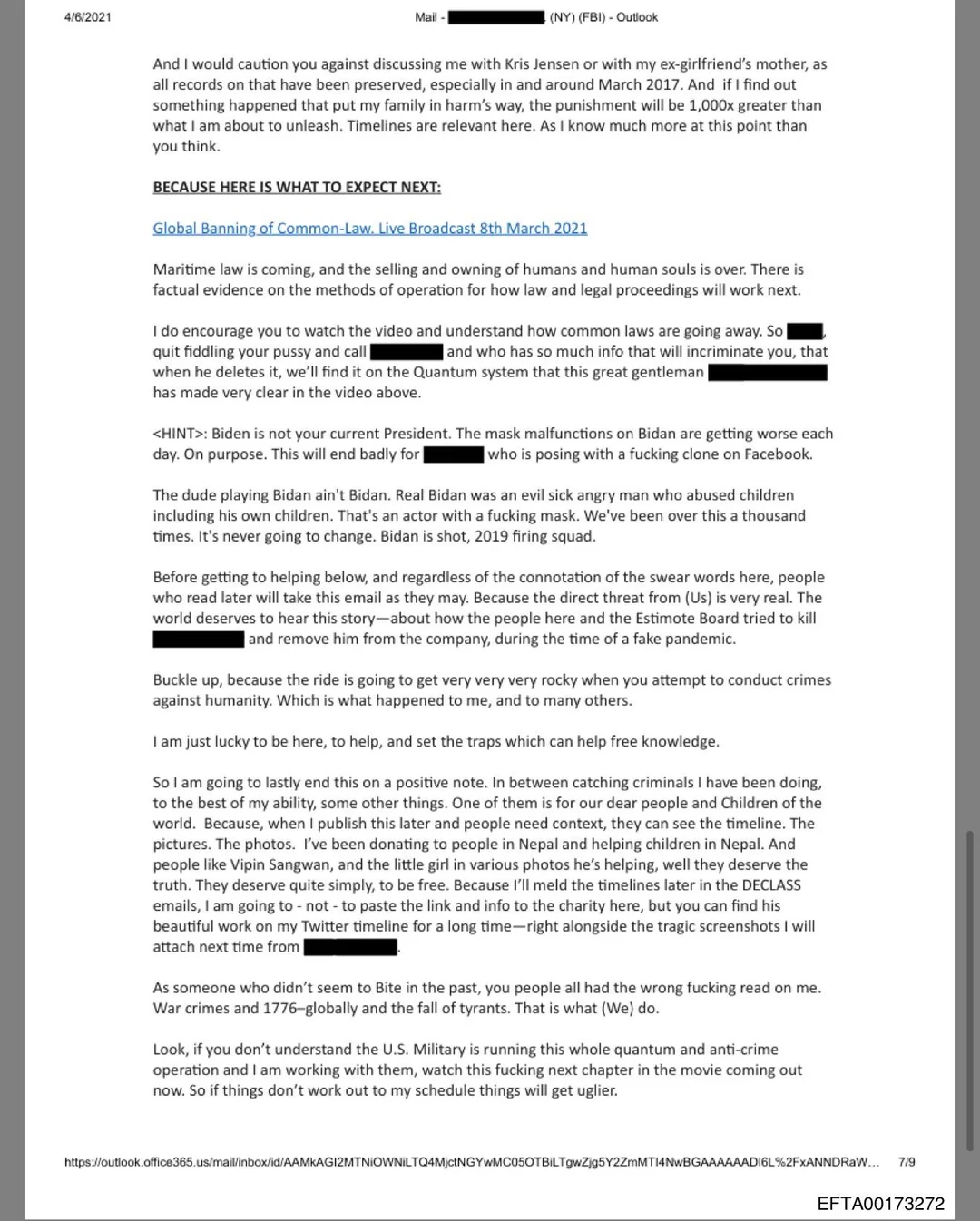 https://www.justice.gov/epstein/files/DataSet%209/EFTA00165439.pdf От: Albert Venczel Кому: Albert Venczel Тема: [ВНЕШНЕЕ ПИСЬМО] — Fw: deputation Альберта (стенограмма) Дата: вт, 31 янв. 2023, 01:31:23 +0000 Важность: обычная FBI, проснитесь и начните работать. Почему все мои предупреждения о будущих событиях спускаются в унитаз? И кстати, бесплатная энергия. Сделайте что-нибудь с этим. Точные предсказания будущих событий, включая терроризм. Энергия нулевой точки работает (инцидент UAP / воспроизводимый контакт). https://youtu.be/m6uZI29TQ_o Подкомитет по бюджету в мэрии, 9:30 утра — 17 января 2023 Городской совет Торонто ОРИГИНАЛ: https://youtu.be/JQ017hz7mxo Доброе утро! Должен существовать закон, обязывающий совет рассматривать депутации в течение 48 часов — это вопрос, в который город должен вмешаться и найти решение. Первый вопрос — это воспроизводимый контакт, как я понимаю, в Райерсоне; журналисты и полиция Торонто располагают признанием похищенной женщины о том, что ее собственный летающий аппарат работает на энергии нулевой точки, и они отказываются делиться этой ценной информацией с остальным миром. Это преступление против человечества: бесплатная энергия может устранить человеческие страдания и решить глобальные кризисные проблемы. Что город собирается сделать для подтверждения того, что контакт с UAP произошел в Райерсоне? Второй вопрос — это предвидение (прекогниция) событий: начиная с 1990 года я передавал полиции Торонто имя/дату/место будущих террористических актов; они всегда растрачивают эту ценную информацию и не знают, что с ней делать. Это снова преступление против человечества. Кому мне сообщать об этих угрозах? Полиция Торонто некомпетентна и проявляет халатность и просто позволяет всем умирать напрасно. Затем они возводят за этим синюю «стену молчания», чтобы все это прикрыть. Довольно легко доказать мои утверждения: «The Review» в деле Макартура/Эпштейна располагает аудиозаписью «коронавирусного» набора предсказаний, куда также входят UkraineJet752 и гибель Коби Брайанта. Сделайте эту аудиозапись публичной. Почему ничего не было предотвращено? «The Review» есть что объяснять. Город может созвать Райерсон на публичные слушания по поводу предупреждений и контакта с UAP. Они будут в шоке, узнав, что прямые предупреждения об инцеле/Дэнфорте/Макартуре поступали еще в 2013 году, включая имена жертв. TPS (полиция Торонто) либо не желает, либо не способна что-то с этим сделать; их вполне устраивает растрачивать новые предупреждения. Несколько репортеров были перекрещены «The Review» — они были честны и дали тот же отчет, что и я; сделайте эти аудиозаписи публичными. Это собственность гражданских лиц, которые за это заплатили. Почему это от них скрывается? EFTA00165439 Многие из предсказаний были сделаны в открытой лекции в Райерсоне — это добавляет еще около 200 честных свидетелей к моим заявлениям. Фактически как минимум 5 «Джейн Доу» имели аномальный человеческий опыт: сверхчеловеческую силу, психические способности, воспроизводимый контакт. Первый шаг — получить публичное признание этих событий. Затем вывести энергию нулевой точки в общественное достояние, учитывать предупреждения и предотвратить следующие террористические атаки, тем самым спасая невинные жизни. Что город делает по этому поводу? Я призываю город найти конструктивное решение этого вопроса в течение ближайших 48 часов. Повестка и справочные материалы: https://sec